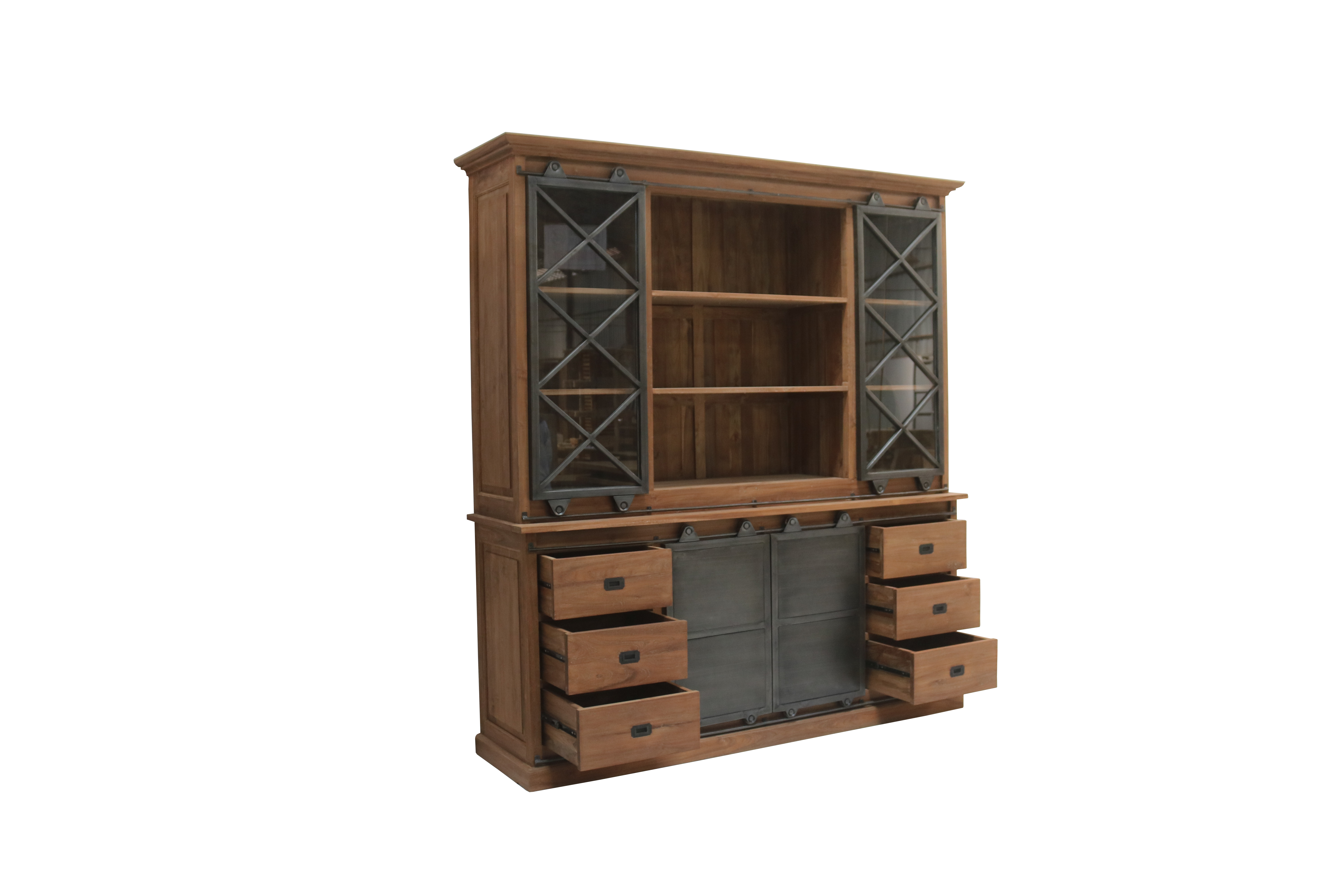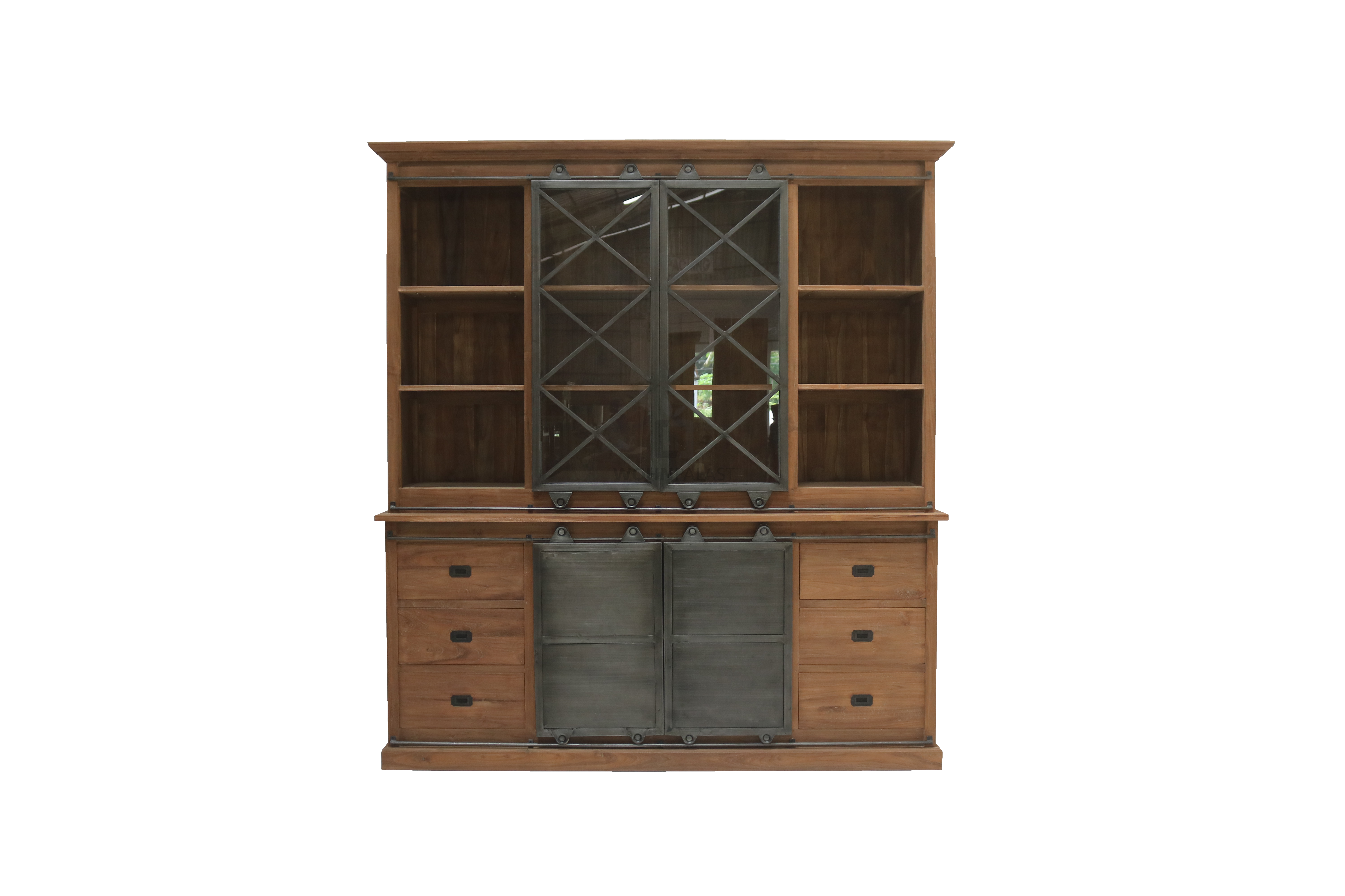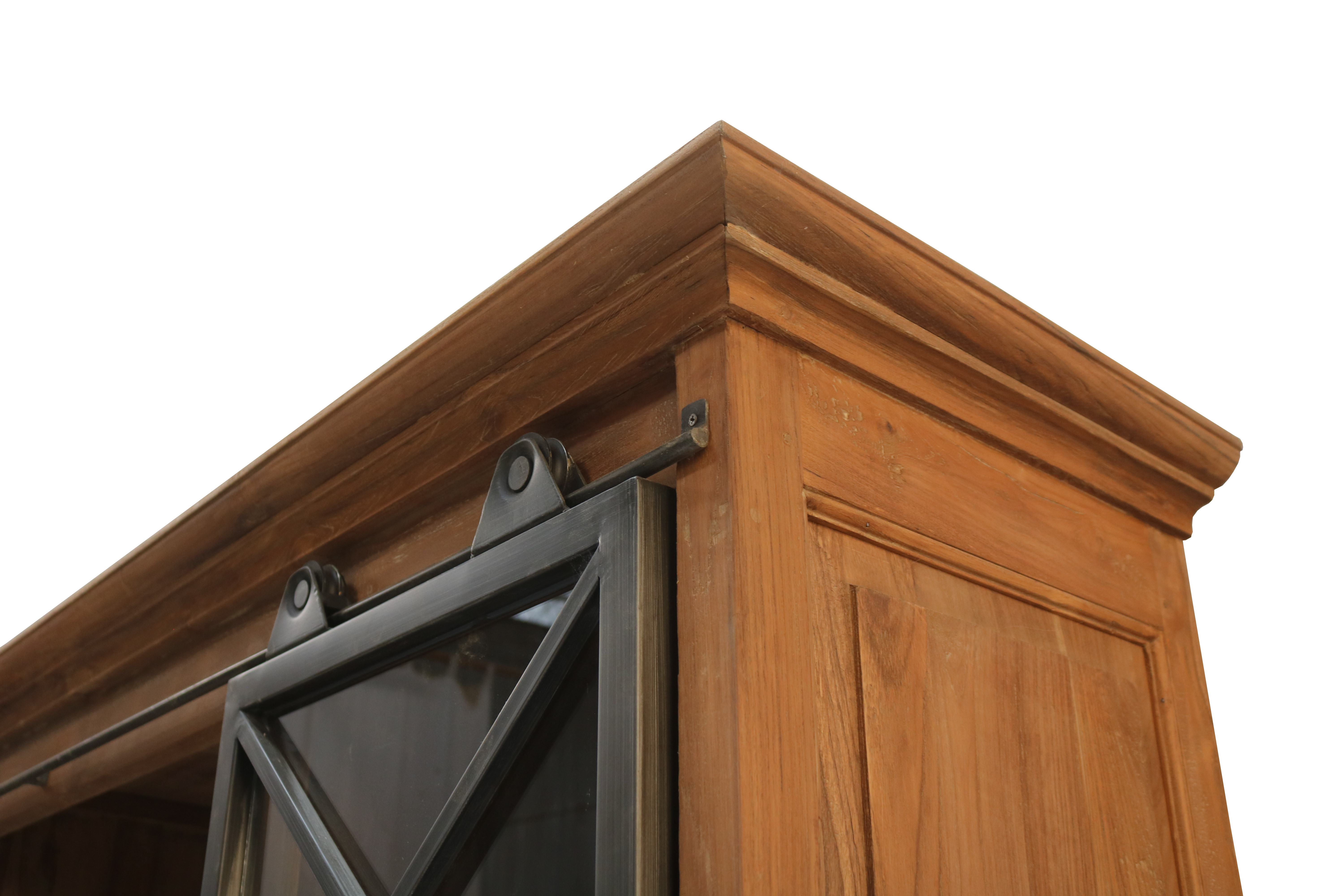 Oberer Schrank: Glasschiebetüren mit robustem Eisenrahmen und feinem Eisenkreuz für stilvolle Produktpräsentation.