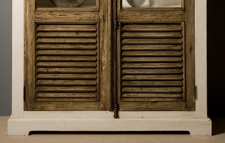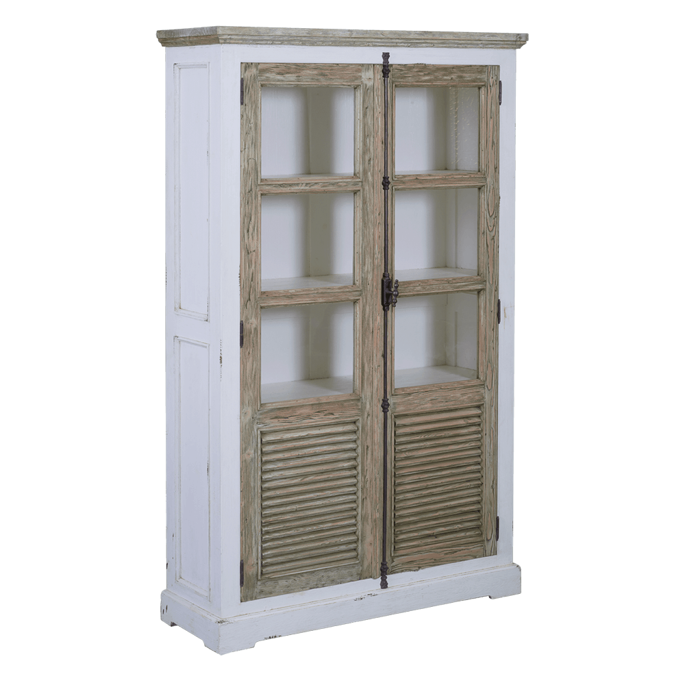 Die VitrineAmanda 120 cm wird auf traditionelle Weise aus teilweise recyceltem Kiefernholz hergestellt. Dieses Möbelstück wird von Hand in Altweiß veredelt und hat eine Schattenpatina, kombiniert mit altgrauer Kiefer. Das gealterte Holz und die schönen Schlösser verleihen dieser Vitrine ihren Charme in romantisch-ländlicher Atmosphäre. Die Vitrine hat zwei Türen. Natürliche Einflüsse in der Farbgebung sind gewollt und gehören zum Landhaustil dazu.