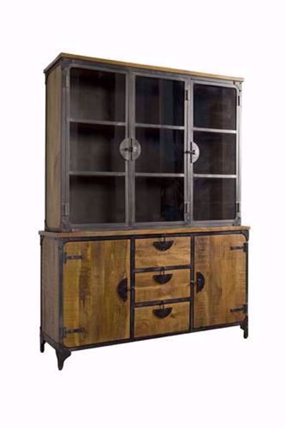 Der Vitrinen Schrank aus der Serie Basto wird auf traditionelle Weise aus Mango Holz hergestellt. Außen ist das Eisen mit dem natürlichen Charme des Mango Holzes sichtbar. Die Front im Vintage-Look gehalten verleiht dieser Vitrine seinen Charme in romantisch Atmosphäre.