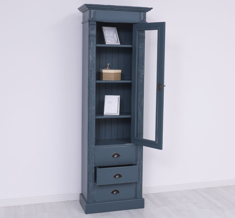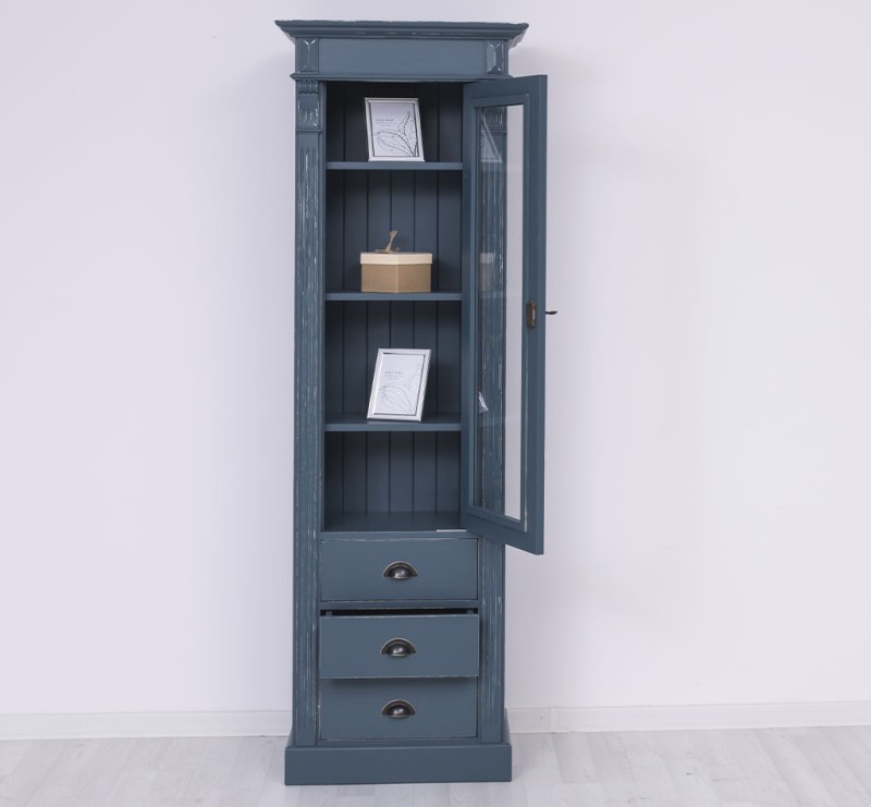 Erfreuen Sie sich an der klassischen Eleganz dieser Vitrine, welche nicht nur über drei Schubladen verfügt, sondern auch hinter einer Glastür im oberen Teil Platz für Dekoration bietet. Diese Vitrine im Landhausstil ist ein hochwertiges, zeitloses Möbelstück, welches überall in Ihrem Haus einen prägenden Eindruck hinterlässt und eine gute Figur macht. Entdecken Sie die ideale Verbindung von Organisation und Präsentation. Dieses Möbelstück vereint auf elegante Weise Funktionalität und Ästhetik.