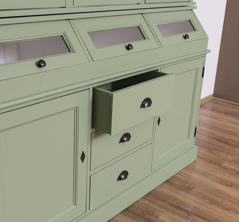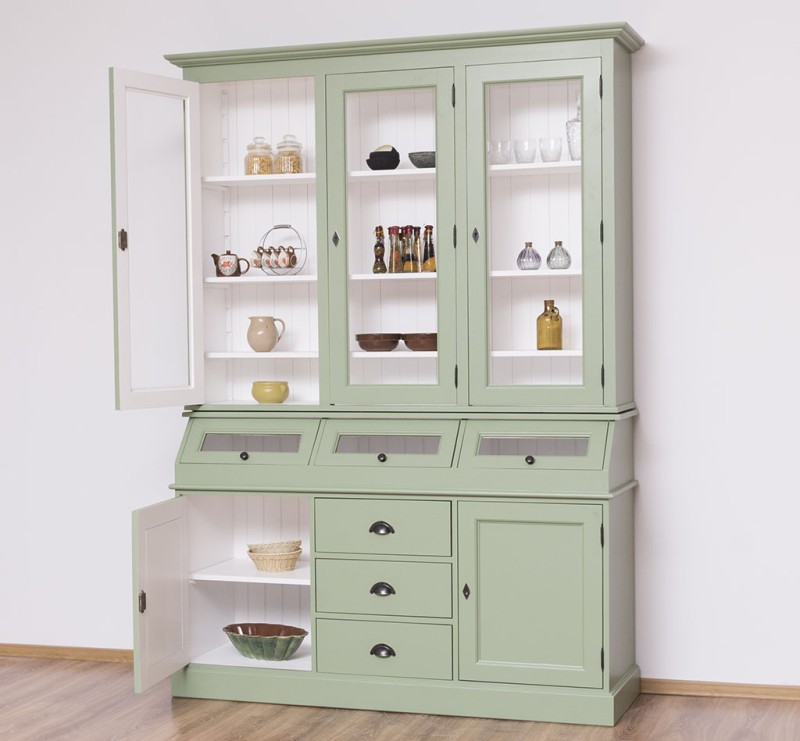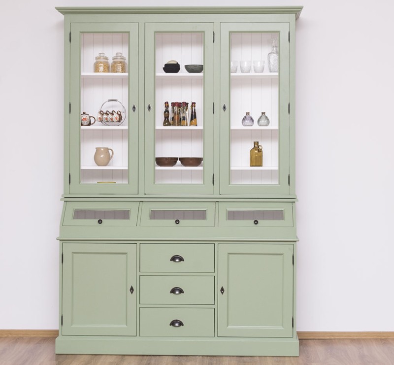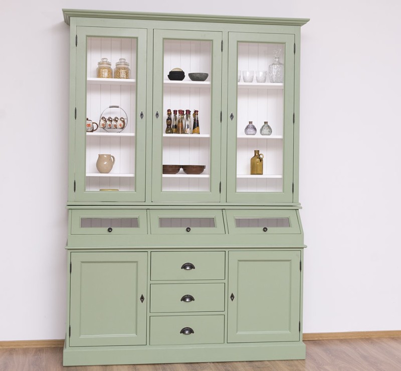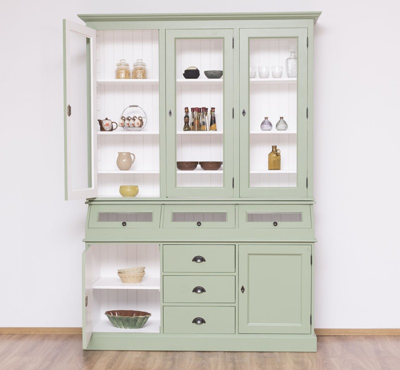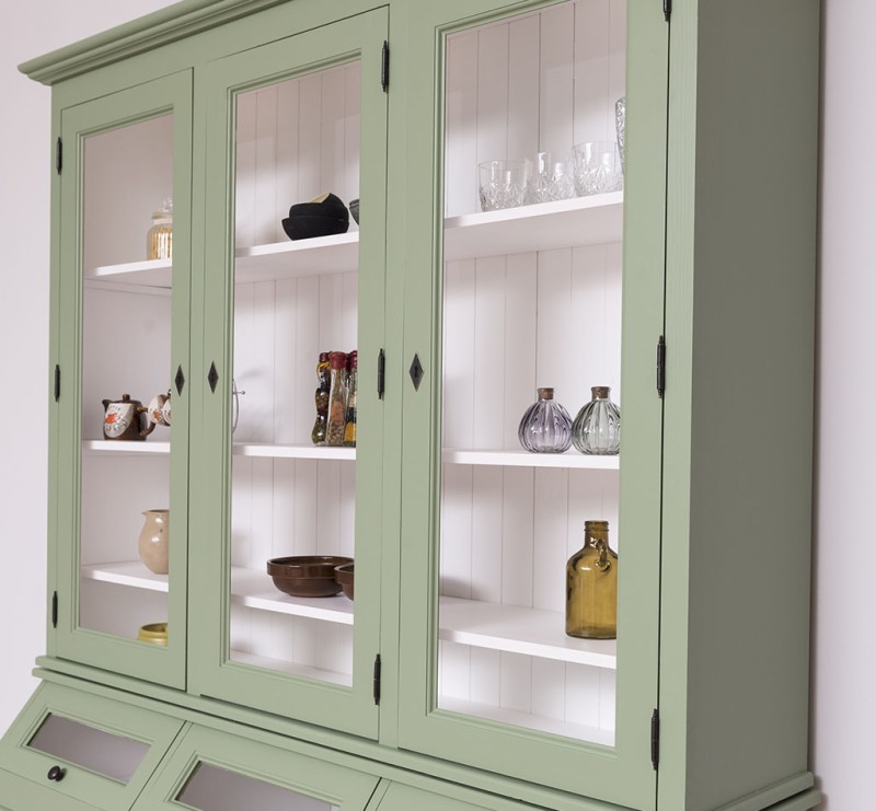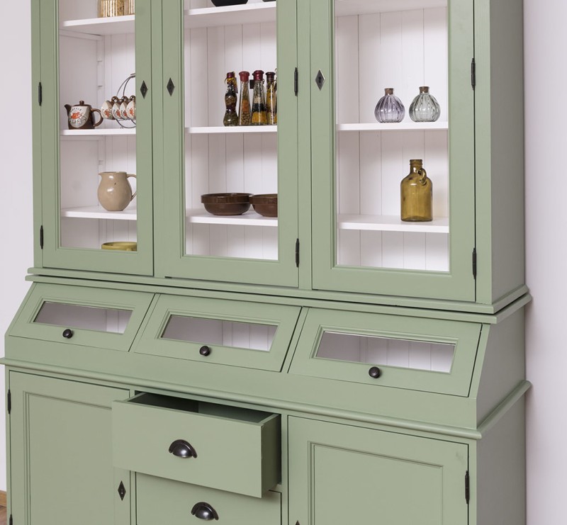 Erfreuen Sie sich an der klassischen Eleganz dieser Vitrine, die im oberen Teil hinter drei großen Glastüren viel Präsentationsfläche bietet und im unteren Teil großzügigen Stauraum bereitstellt. Dieses Buffet im Landhausstil ist ein hochwertiges, zeitloses Möbelstück, das in jedem Raum Ihres Hauses einen prägenden Eindruck hinterlässt und eine gute Figur macht.