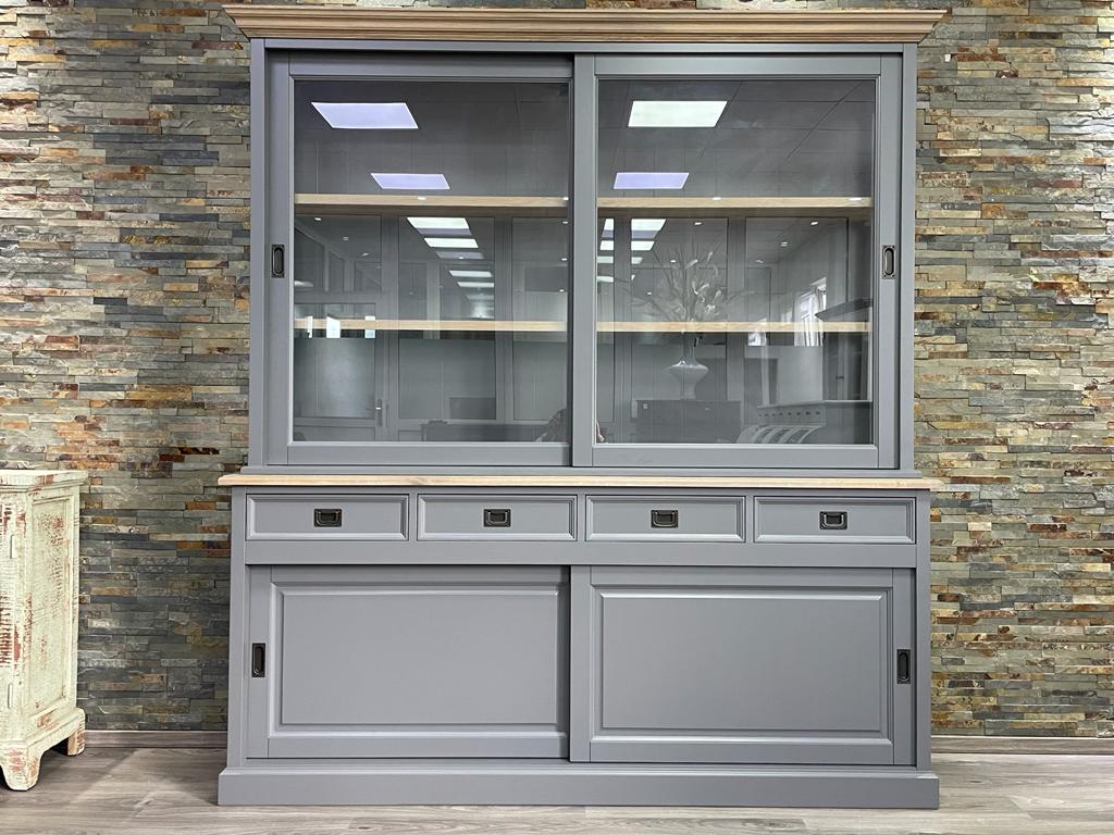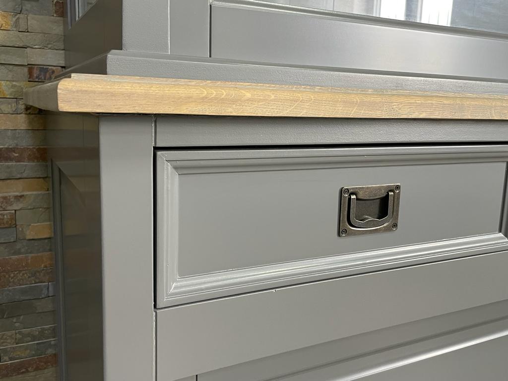Eine schöne Vitrine im angesagten Landhausstil. Die Vitrine ist mit großen Schiebetüren und zwei Schubladen ausgestattet. Die Armaturen sind in schwarz gehalten, des Weiteren sind Krone und Zwischenplatte in Eiche Natur abgesetzt. Ihre Einrichtungsgegenstände lassen sich durch die klare Glasfront wunderbar präsentieren. Abmessungen(H/B/T): 220/150/40-50 cm zwei Schubladen mit praktischen Schiebetüren schöne Glasfront schwarze Armaturen Eichenelemente Landhaus Vitrine RAL 7035