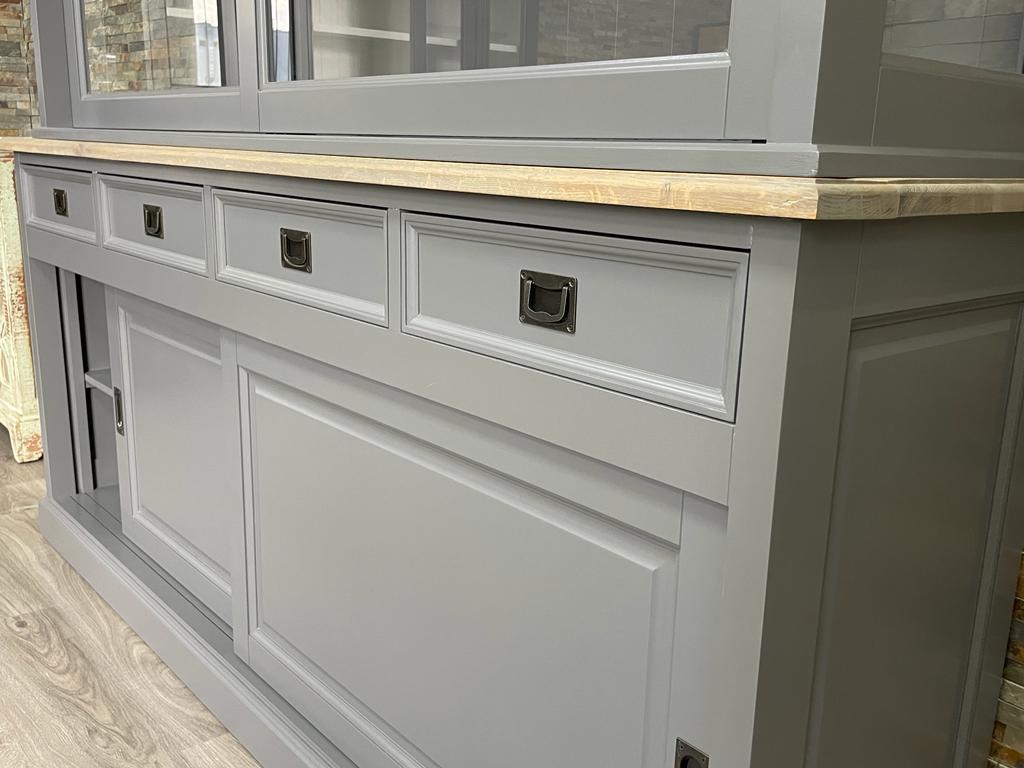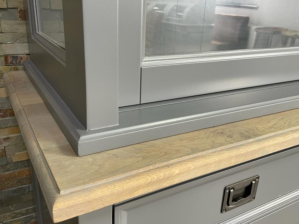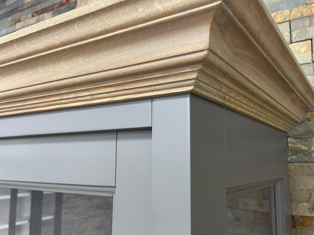 Unsere Landhaus Vitrine aus der Serie Vincenza ist eine schöne 2-teilige Vitrine im angesagten Landhausstil. Die Vitrine ist mit großen Schiebetüren und Schubladen ausgestattet. Die Armaturen sind in verschiedene Farben gehalten, des Weiteren sind Krone und Zwischenplatte in Eiche abgesetzt. Ihre Einrichtungsgegenstände lassen sich durch die klare Glasfront wunderbar präsentieren. Unsere Landhaus Möbel aus der Serie Vincenza sind langlebig und von Hand gefertigt. Die Schubladen sind leichtläufig und mit einer soft-close Funktion ausgestattet. Der Vitrinen Schrank bietet Ihnen viel Stauraum für Bücher, Geschirr, Gläser und Accessoires an. Der Schrank wird zweiteilig montiert angeliefert. Das Oberteil wird nur auf das Unterteil gestellt und ist direkt wohnfertig. Finden Sie bei uns viele schöne Landhausmöbel: Schränke, Kommoden, Vitrinen, antike Buffets, Tische und Stühle. Fertig montiert und direkt nach Hause geliefert. Abmessungen(H/B/T): 220 X 150 X 50 CM Höhe Oberteil: 130cm Höhe Unterteil: 90cm Details: Gewicht: 150 cm: ca. 120 kg Stil: Landhaus Farbe: Diese Vitrine ist in verschiedenen RAL-Farben erhältlich. Konzept: Vincenza mit Schiebetüren 2 Schubladen Fertig montiert 2 teilig Ober & Unterteil