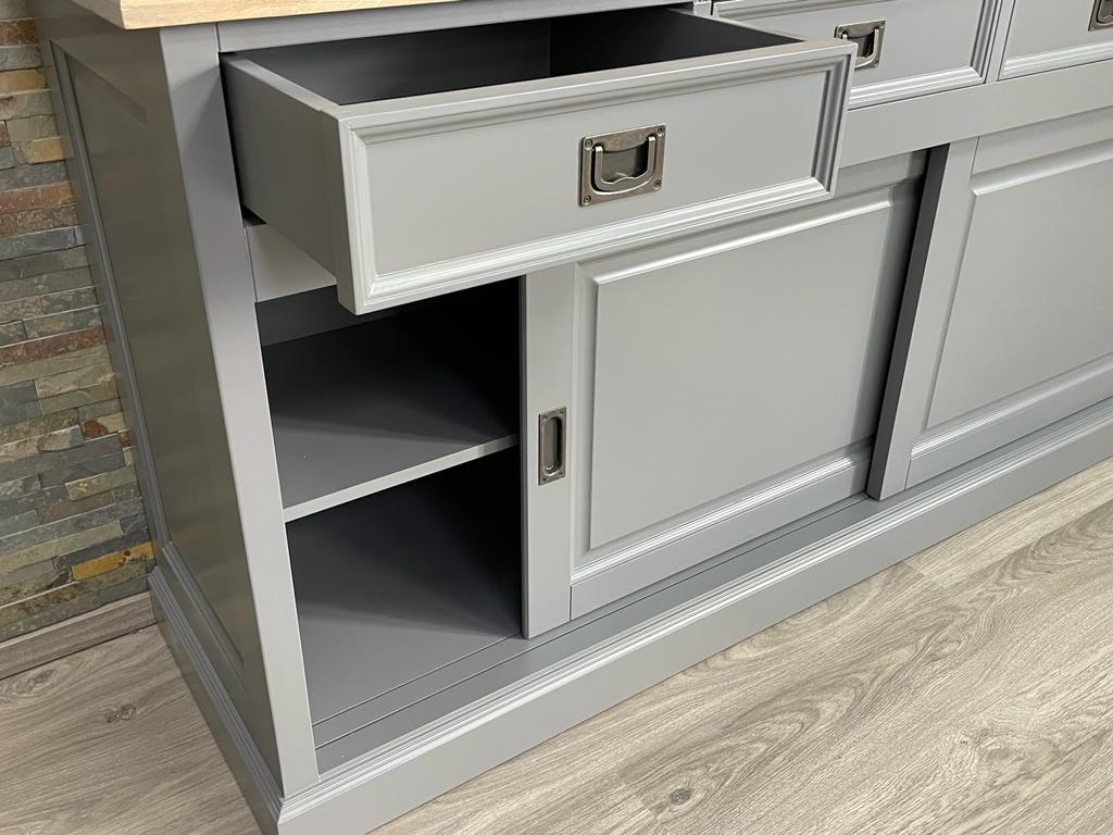 Ein moderner Buffetschrank mit Schiebetüren aus unserer Living Serie. Unsere Landhaus Möbel sind hochwertig und zeitlos. Jedes Möbelstück wird individuell gefertigt. Das Unterteil bietet viel Stauraum hinter den Türen. Im oberen Bereich mit der Glasfront haben Sie die Möglichkeit Ihre Dekoartikel, Geschirr und Wohnaccessoires zu präsentieren. Der zweiteilige Buffetschrank ist ab 120cm breite erhätlich und 220 cm hoch. Unser großer Living Schrank wird Sie sofort begeistern. Der Schrank passt hervorragend in ein großes offenes Wohnzimmer oder in die neue Wohnküche. Auf Wunsch in jeder anderen RAL-Farbe erhältlich und in anderen Abmessungen lieferbar. Gerne bieten wir den Schrank auch in Ihren Wunschmaßen an. Bitte sprechen Sie uns an. Leichte Abweichungen in Farbe und gegenüber den Bildern bleiben vorbehalten. Verschiedene Abmessungen und RAL Farben wählbar: Details: Farbe weiß Pinienholz fertig montiert 2-teilig Schiebetüren Schubladen