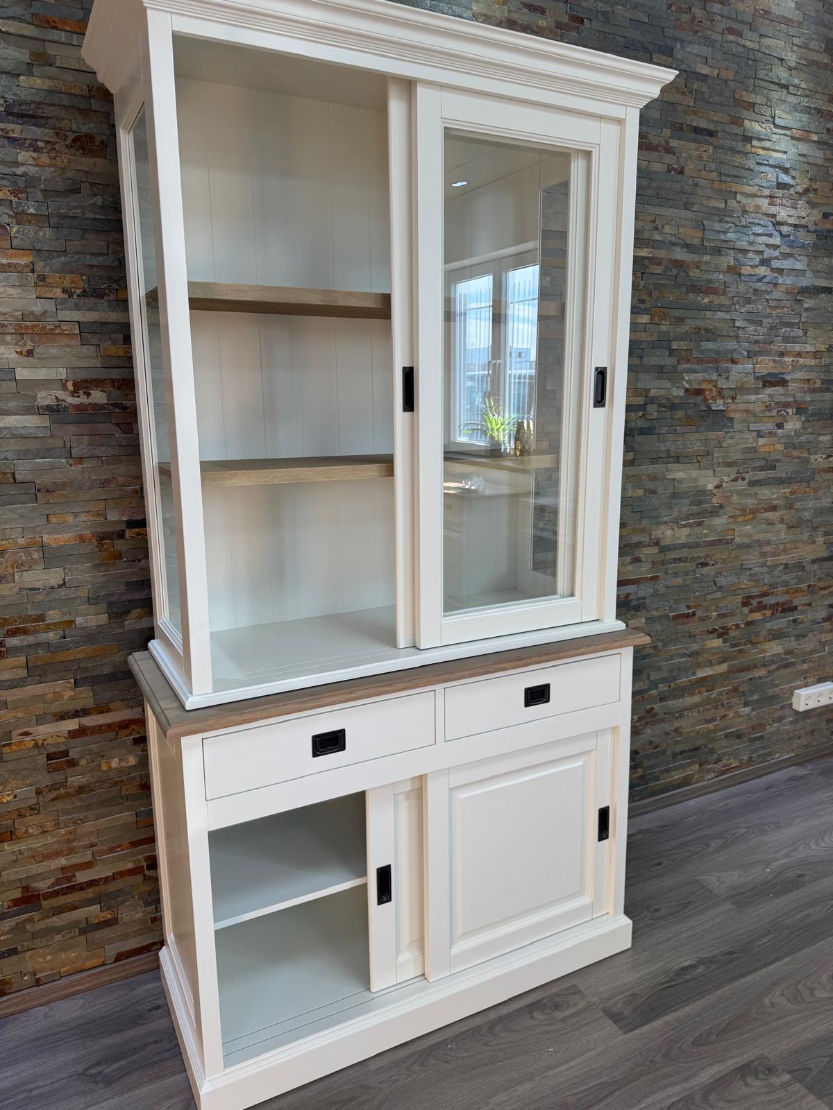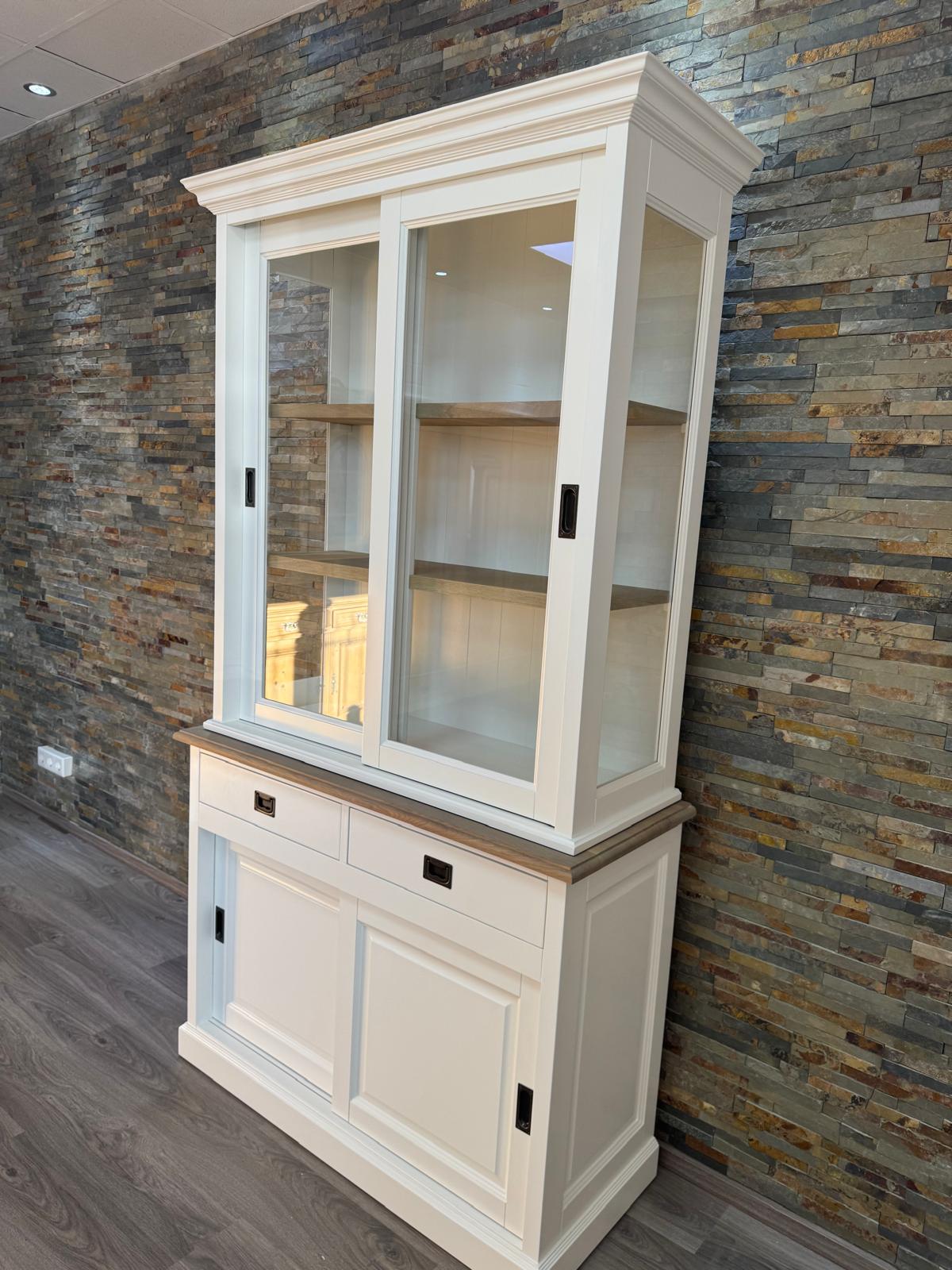 Ein moderner Buffetschrank mit Schiebetüren aus unserer Living Serie. Unsere Landhaus Möbel sind hochwertig und zeitlos. Jedes Möbelstück wird individuell gefertigt. Das Unterteil bietet viel Stauraum hinter den Türen. Im oberen Bereich mit der Glasfront haben Sie die Möglichkeit Ihre Dekoartikel, Geschirr und Wohnaccessoires zu präsentieren. Der zweiteilige Buffetschrank ist ab 120cm breite erhätlich und 220 cm hoch. Unser großer Living Schrank wird Sie sofort begeistern. Der Schrank passt hervorragend in ein großes offenes Wohnzimmer oder in die neue Wohnküche. Auf Wunsch in jeder anderen RAL-Farbe erhältlich und in anderen Abmessungen lieferbar. Gerne bieten wir den Schrank auch in Ihren Wunschmaßen an. Bitte sprechen Sie uns an. Leichte Abweichungen in Farbe und gegenüber den Bildern bleiben vorbehalten. Verschiedene Abmessungen und RAL Farben wählbar: Details: Farbe weiß Pinienholz fertig montiert 2-teilig Schiebetüren Schubladen