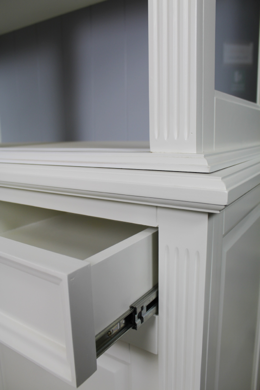 Ein schöner Ladenschrank im Landhaus Stil. Der Korpus ist komplett in weiß gehalten, während der Innenraum sich mit einem hellen Grauton abhebt. Mit viel Stauraum hinter den drei Schiebetüren. Die Vitrine im angesagten Landhaus-Stil ist ein zeitloses Möbelstück, welches überall in Ihrem Haus einen prägenden Eindruck hinterlässt. Neben viel Stauraum im unteren Bereich, bietet Ihnen der obere Bereich mit Glasfront die Möglichkeit, durch Wohnaccessoires den Landhaus-Stil zu unterstreichen. Das Buffet ist außen weiß und innen grau lackiert.