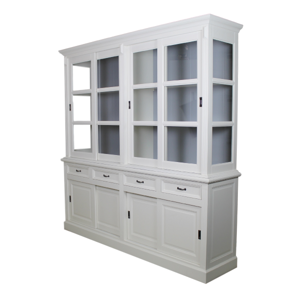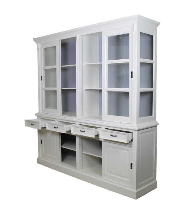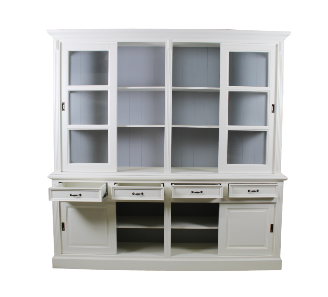Ein großer Ladenschrank in 220 cm Breite, Farbe weiß. Der Schrank wirkt zeitlos schön und ist auch noch nach vielen Jahren attraktiv und schön zu betrachten. Jedes Modell ist ein Unikat. Die kleinen Unregelmäßigkeiten in der Struktur des Holzes lassen den Artikel authentisch wirken. Mit vier großen Schubladen,Türen, sowie Vitrinentüren mit Glasfront für zusätzlichen Stauraum oder Deko. Die hochwertige Verarbeitung und die unverwechselbare Optik machen diese Vitrine zu einem echten Hingucker. Eine Vitrine mit Charakter, die Sie ein Leben lang begleiten wird! Abmessungen(H/B/T): 220/220/50 cm Höhe Oberteil: 130 cm Höhe Unterteil: 90 cm Details: Wunderschöne Landhaus Vitrine Oben 4 Glasschiebetüren, unten 4 Holzschiebetüren Griffe aus Metall in Bronze-Optik Sehr gute Qualität und Verarbeitung Tolle Linienverzierungen Fertig montiert, 2-teilig Gewicht ca. 150 kg