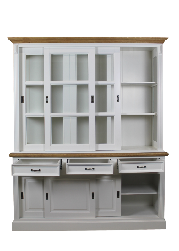 Eine schöne 2-teilige Vitrine im angesagten Landhausstil. Die Vitrine ist mit großen Schiebetüren und drei Schubladen ausgestattet. Die Armaturen sind in schwarz gehalten, des Weiteren sind Krone und Zwischenplatte in Eiche abgesetzt. Ihre Einrichtungsgegenstände lassen sich durch die klare Glasfront wunderbar präsentieren. Unsere Landhaus Möbel aus der Serie Vincenza sind langlebig und von Hand gefertigt. Die Schubladen sind leichtläufig und mit einer soft-close Funktion ausgestattet. Der Vitrinen Schrank bietet Ihnen viel Stauraum für Bücher, Geschirr, Gläser und Accessoires an. Der Schrank wird zweiteilig montiert angeliefert. Das Oberteil wird nur auf das Unterteil gestellt und ist direkt wohnfertig.