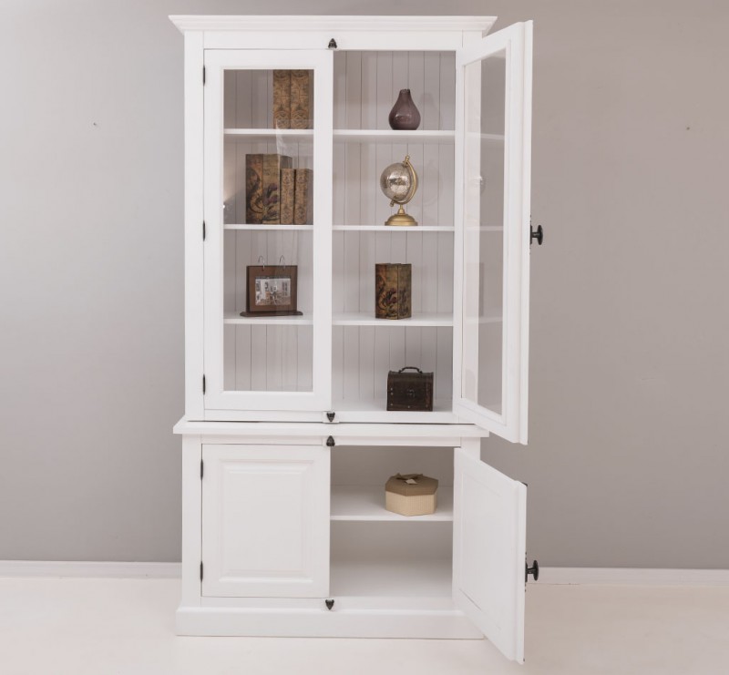 Der obere Bereich der Vitrine offeriert zwei verstellbare Einlegeböden, jeweils im Abstand von 7 cm, hinter zwei klassischen Glastüren. Im unteren Teil finden Sie geräumigen Stauraum hinter zwei Volltüren – praktisch und stilvoll zugleich.
