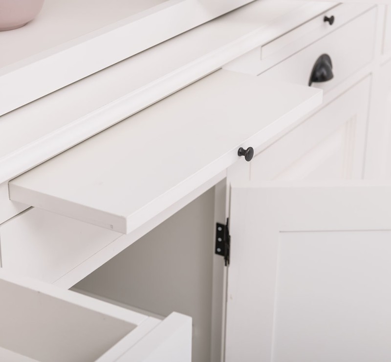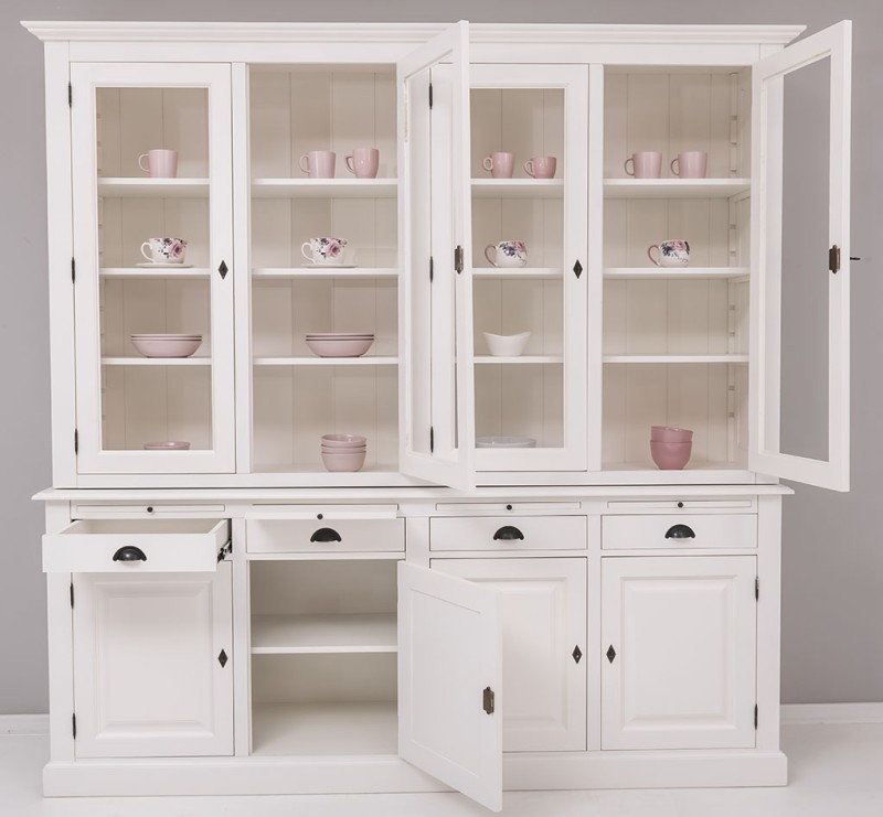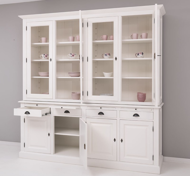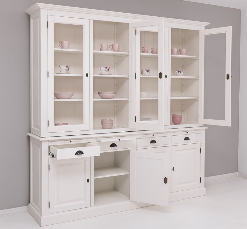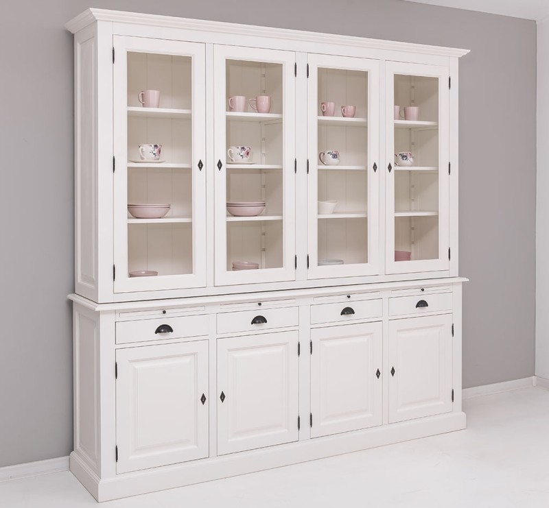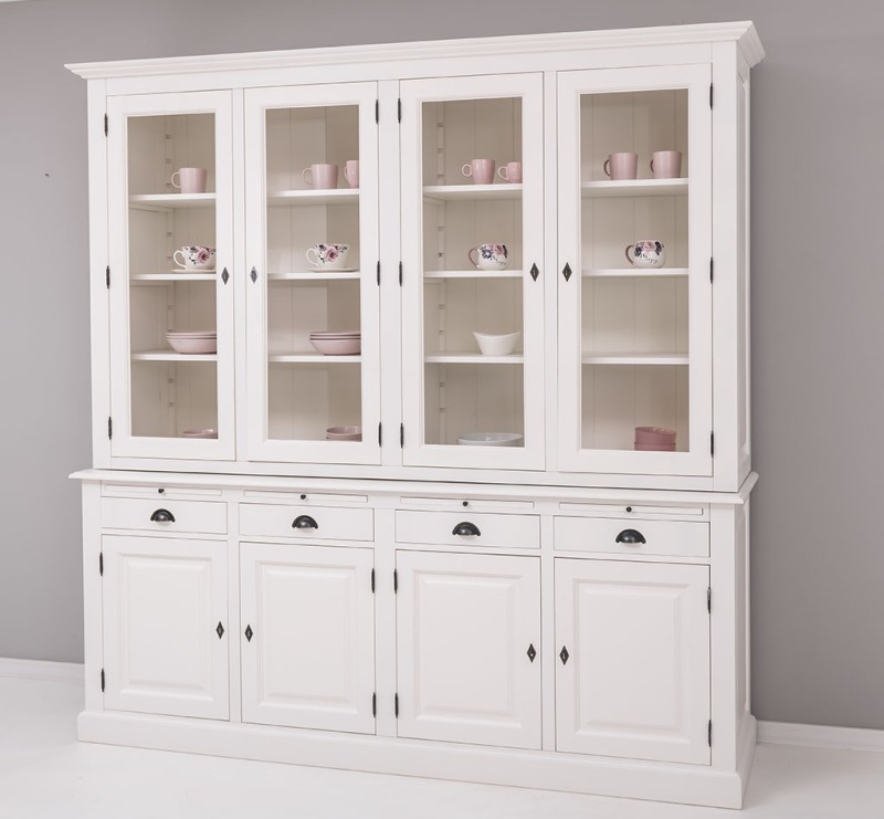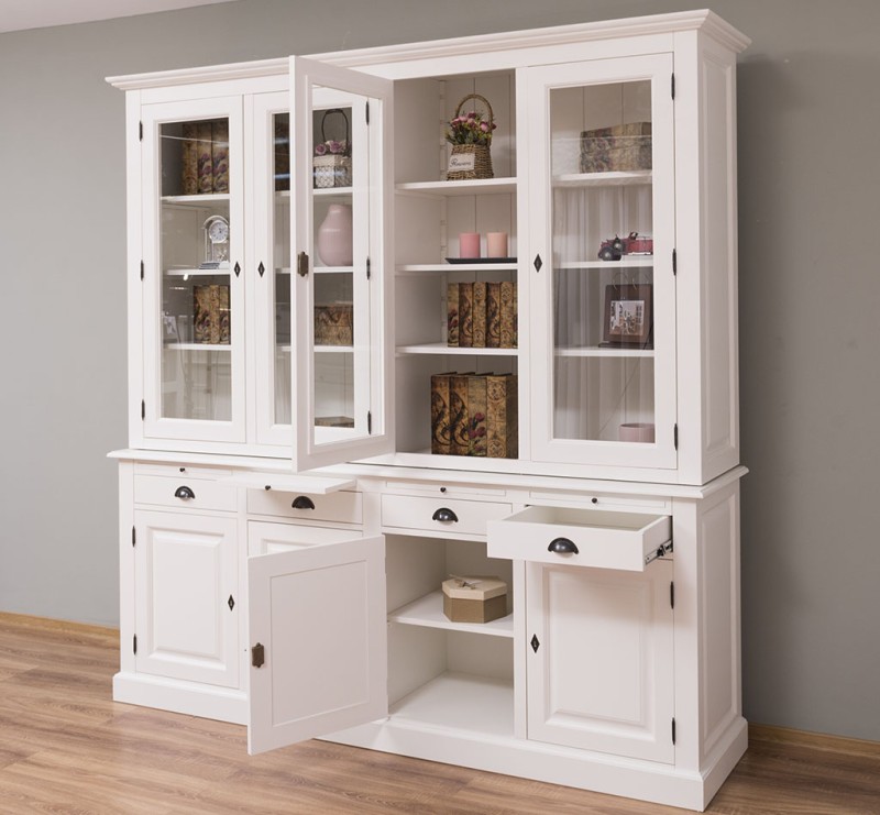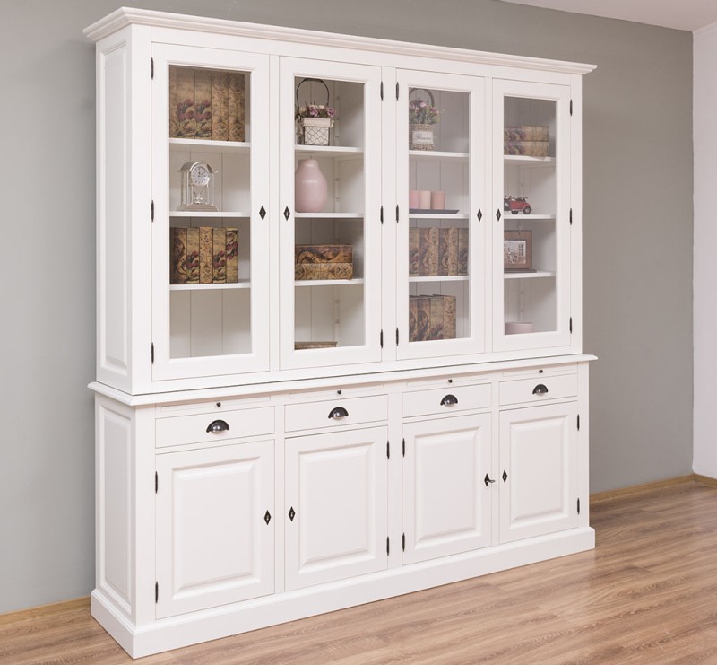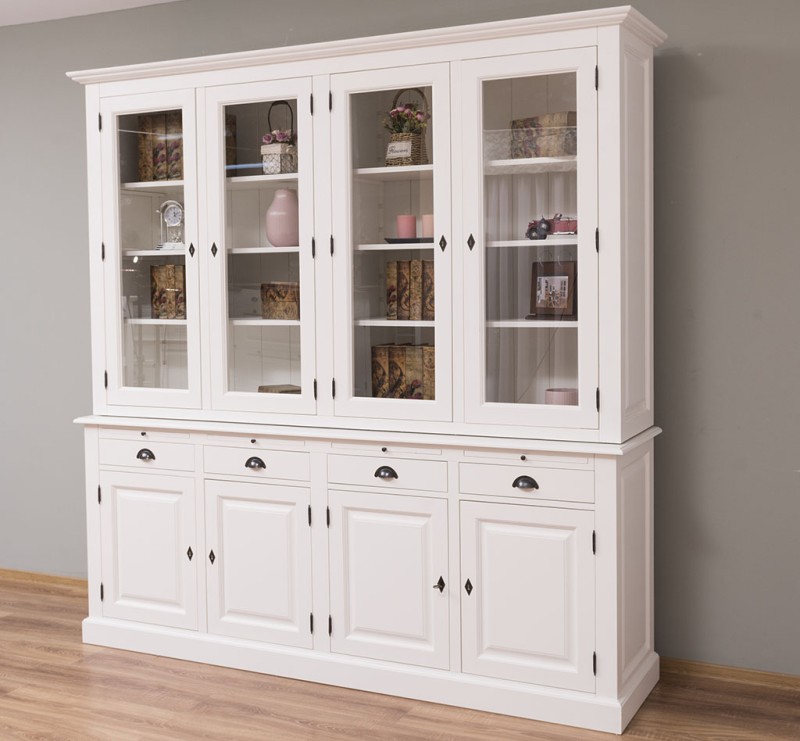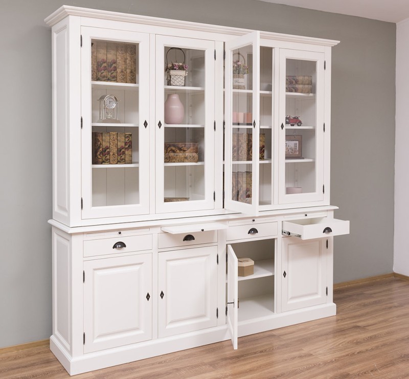 Erfreuen Sie sich an der klassischen Eleganz dieser Vitrine, welche nicht nur über vier geschlossene Türen und vier Schubladen verfügt, sondern auch hinter den vier großen Glastüren im oberen Teil Platz für Dekoration bietet. Diese Vitrine im Landhausstil ist ein hochwertiges, zeitloses Möbelstück, welches überall in Ihrem Haus einen prägenden Eindruck hinterlässt und eine gute Figur macht. Entdecken Sie die ideale Verbindung von Organisation und Präsentation. Dieses Möbelstück vereint auf elegante Weise Funktionalität und Ästhetik.