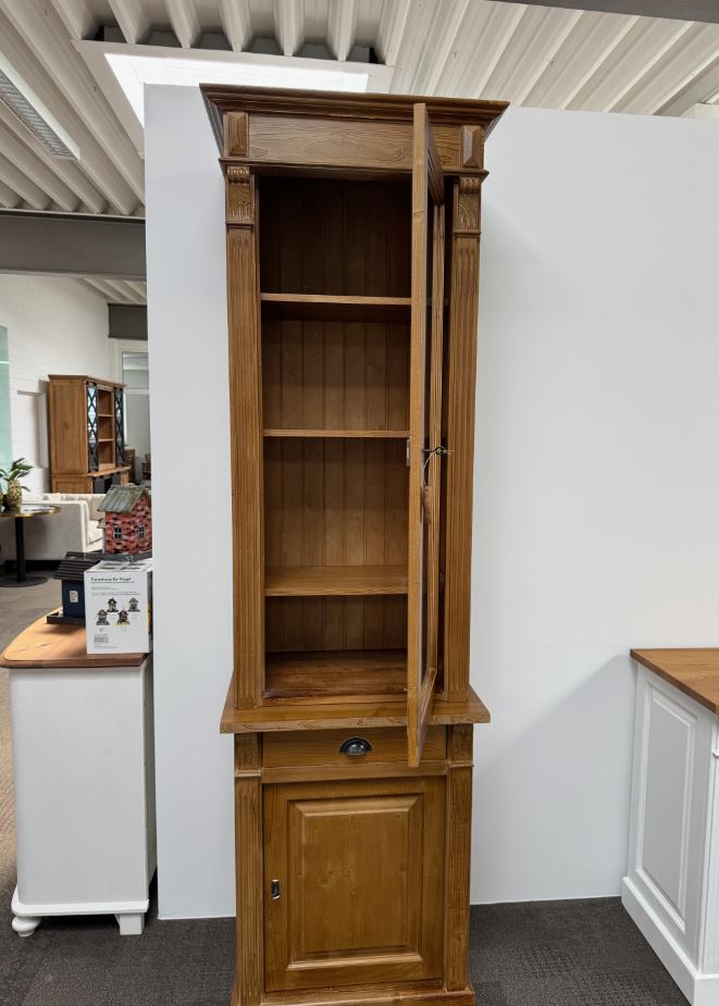 Erfreuen Sie sich an der klassischen Eleganz dieser Vitrine, welche hinter einer großen Glastür Platz für Dekoration bietet. Diese Vitrine im Landhausstil ist ein hochwertiges, zeitloses Möbelstück, welches überall in Ihrem Haus einen prägenden Eindruck hinterlässt und eine gute Figur macht. Entdecken Sie die ideale Verbindung von Organisation und Präsentation. Dieses Möbelstück vereint auf elegante Weise Funktionalität und Ästhetik. Abmessungen: H: 220 cm, B: 75cm, T: 40 cm Landhaus-Stil massives Kiefernholz Farben innen und aussen wählbar montiert