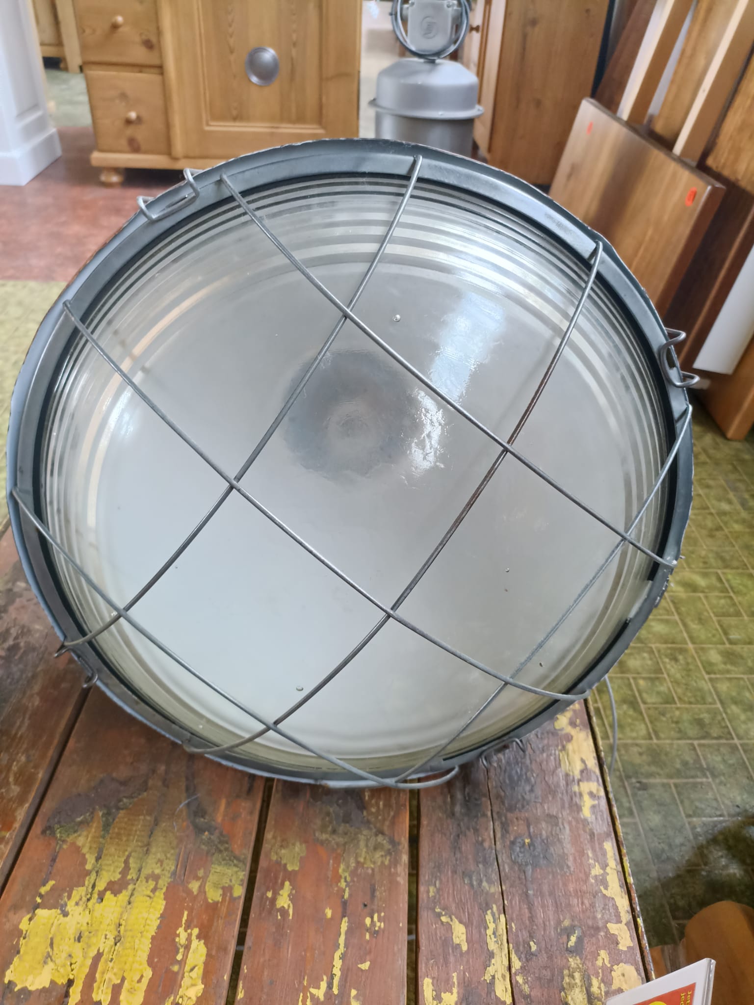 Original Industrielampe kupferfarbig mit Glas und Gitter
