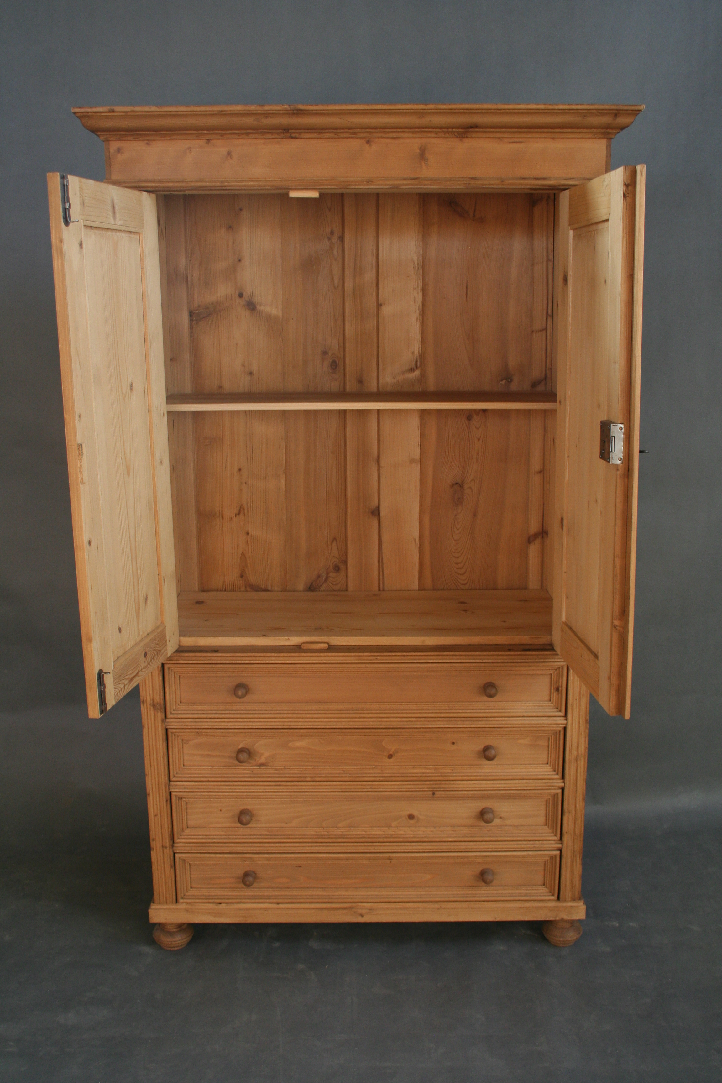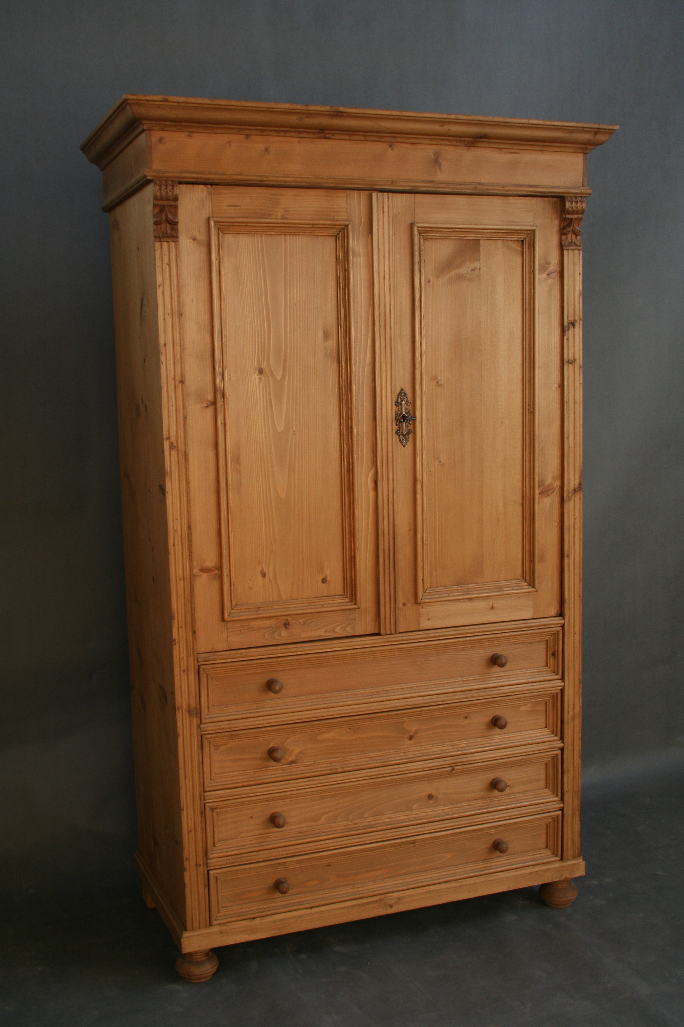 Ein Weichholz Schrank im Landhaus Stil. Der Schrank hat viel Stauraum und ein Innenausbau. Die großen Schubladen bieten Ihnen jede Menge Platz für Ihre Garderobe an. Der Schrank ist in unserer Fachwerkstatt aufgearbeitet und befindet sich in einem wohnfertigem Zustand. Der Schrank wurde nach alten Vorlagen aus Altholz neu gebaut. Beim Finish benutzen wir hochwertiges natürliches Bienenwachs. Die vorhandenen Gebrauchsspuren haben einen antiken Charakter und sind bewusst gewollt. Ein Schrank ideal für die Diele, Kinderzimmer oder Ihr Arbeitszimmer.