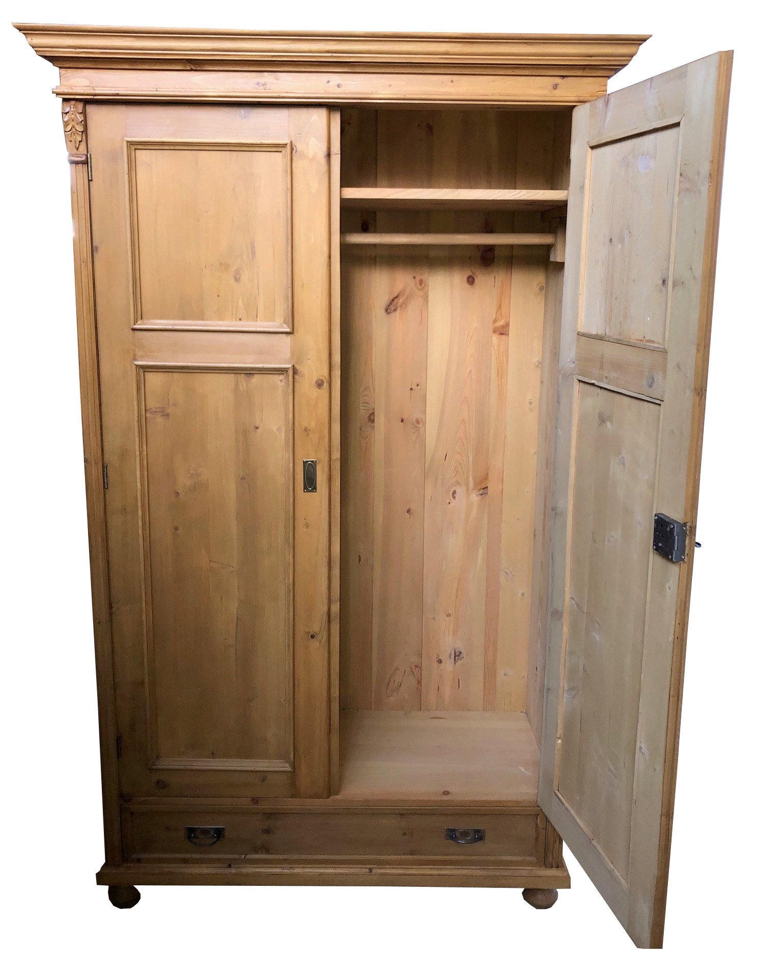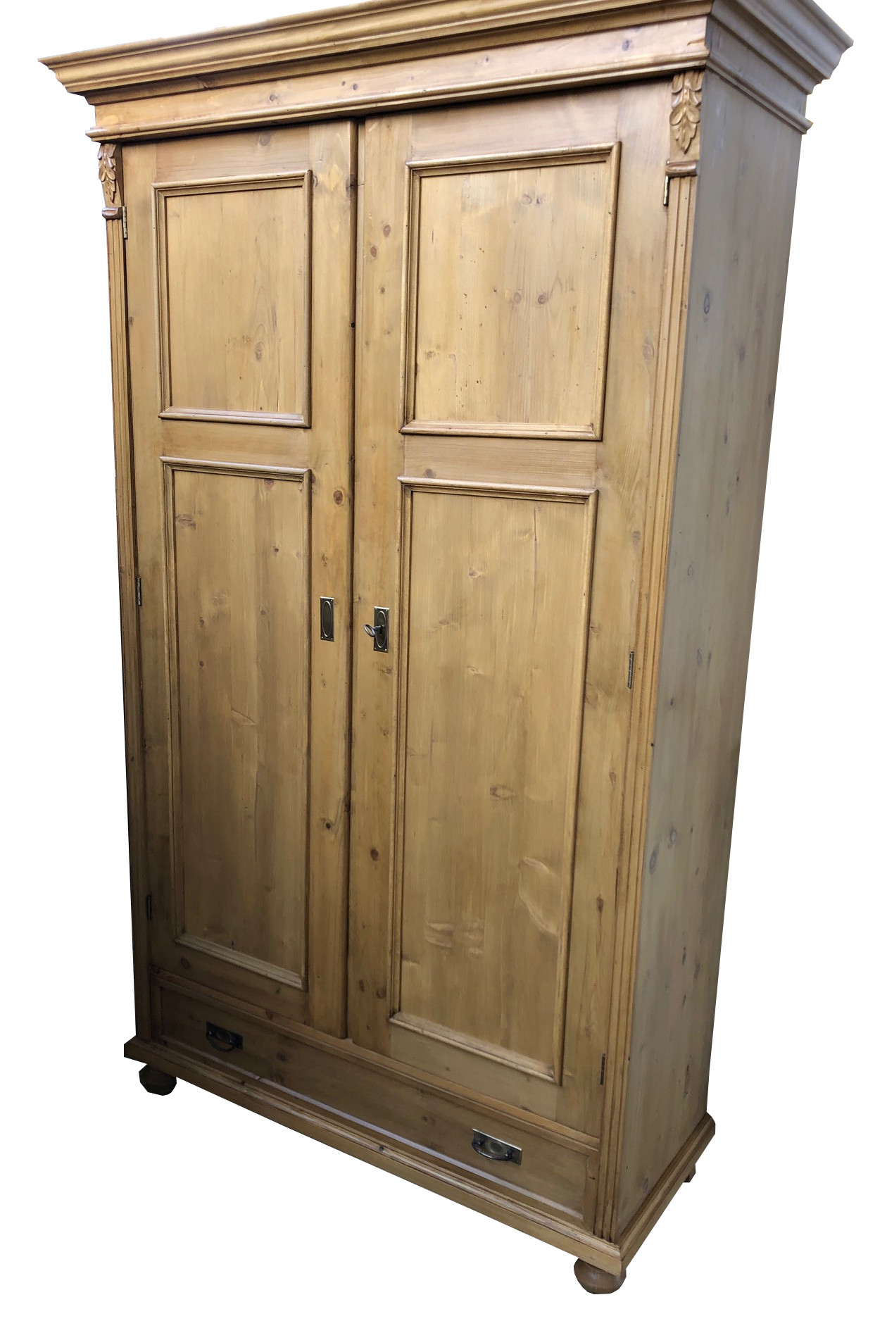 Ein Weichholz Schrank nach alten Vorlagen aus Altholz gebaut. Der Kleiderschrank hat eine große Schublade und 2 Türen mit Messigbeschlägen. Hinter der Doppeltüre befindet sich 1 durchgehender Boden und eine Kleiderstange. Der Schrank befindet sich in einem wohnfertigem Zustand. Der Schrank wurde von Hand gewachst und aufpoliert. Dieses Möbelstück wird nicht nur Ihr Eigenheim in neuem Glanz erstrahlen lassen, sondern durch seine Langlebigkeit und Anblick Sie auf Dauer erfreuen.