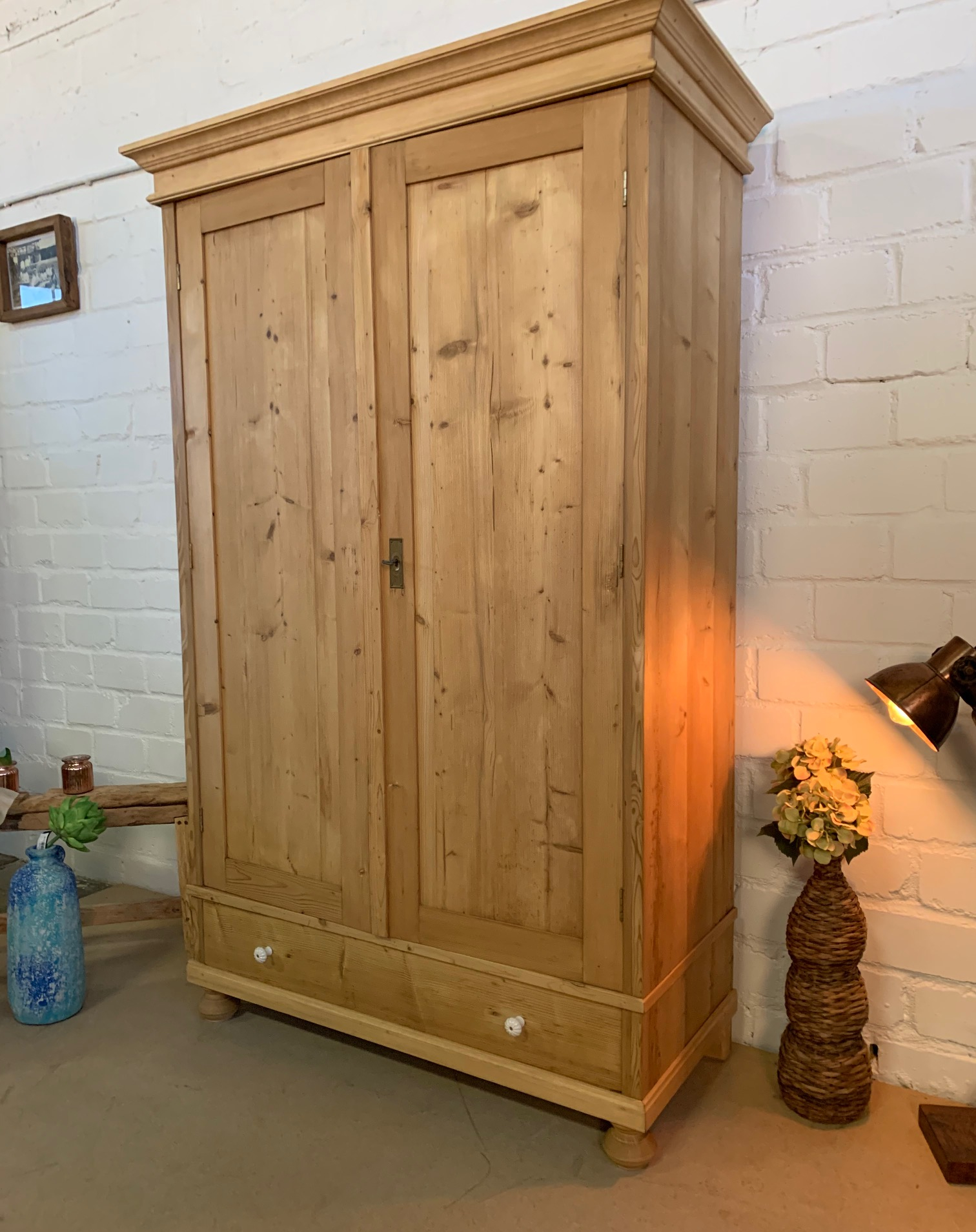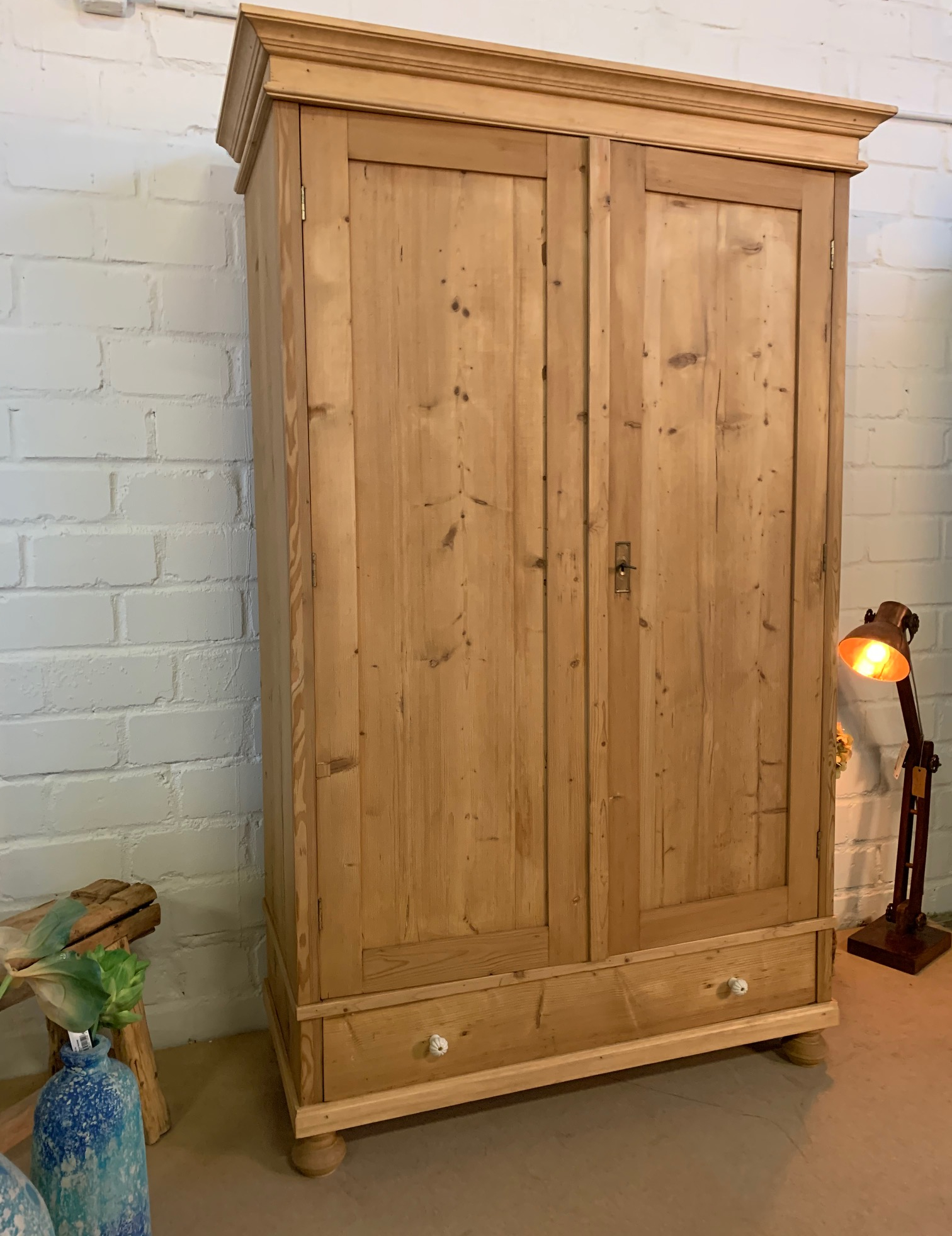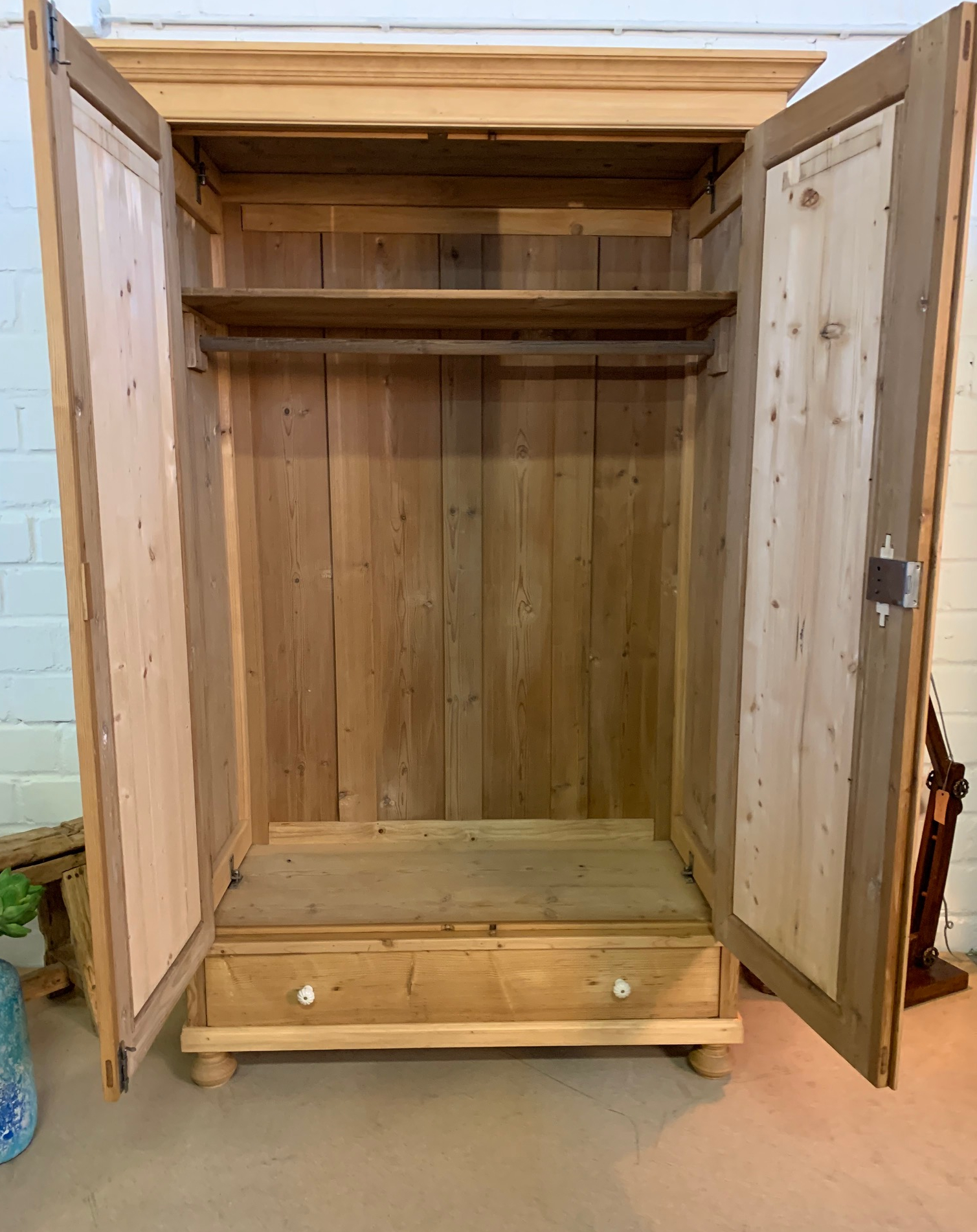 Ein schöner Jugendstil Kleiderschrank im wohnfertigen Zustand. Der Schrank wurde behutsam restauriert und mit hochwertigen Bienenwachs gewachst und aufpoliert. Der Schrank ist komplett zerlegbar. Mit einer Kleiderstange und ein Regalboden. Zusätzlicher Stauraum durch eine Schublade. Das Möbelstück ist komplett aus Massivholz. Ein schöner Kleiderschrank für Ihr zu Hause! Weichholzmöbel & mehr. Antike Schränke, Kommoden, antike Tische, Dielenschrank, Vertiko und mehr bei wohnpalast. de bestellen. Die Abmessungen: Höhe: 205 cm. Breite: 121 cm. Tiefe: 61 cm.