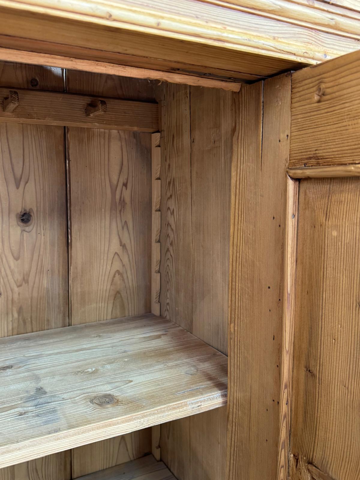 Ein schöner Dielen Schrank aus Weichholz. Der Innenausbau beinhaltet stabile Regalböden. Der Schrank ist in unserer Fachwerkstatt restauriert worden und befindet sich in einem guten wohnfertigem Zustand. Bitte beachten Sie, dass es sich um ein antikes Möbelstück handelt. Der Schrank wurde von traditionellen Handwerkern gefertigt. Die vorhandenen Gebrauchsspuren haben einen antiken Charakter und sind bewusst gewollt. Ein Schrank der Sie ein Leben lang begleiten wird! Abmessungen: H/B/T- 170/65/50cm Beschreibung Schrank aus massivem Weichholz mit Bienenwachs gewachst mit Fachböden ausgebaut der Schrank ist nicht zerlegbar