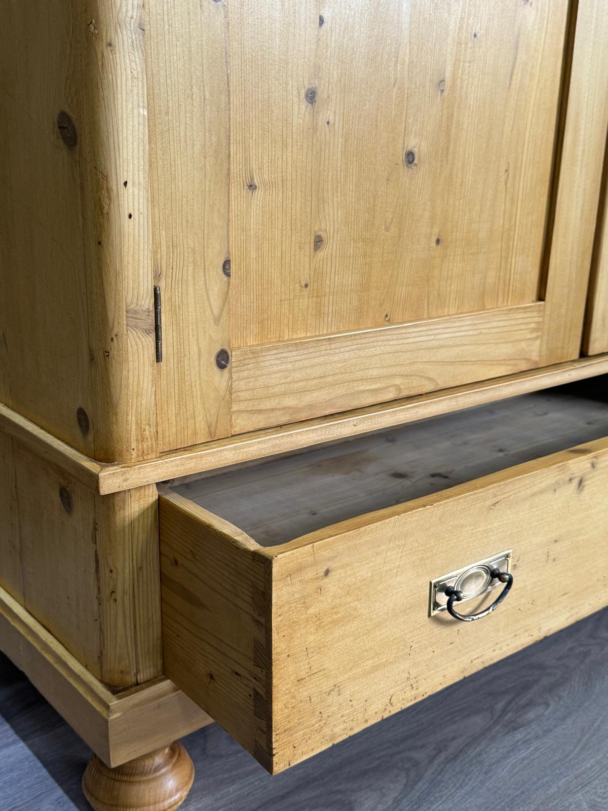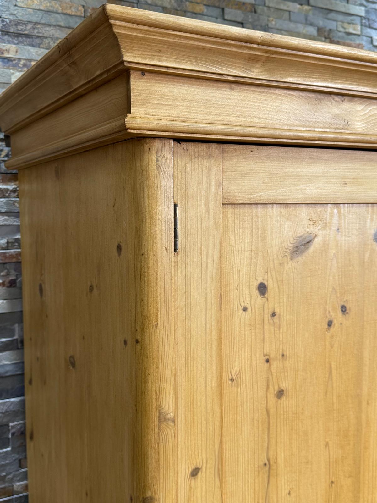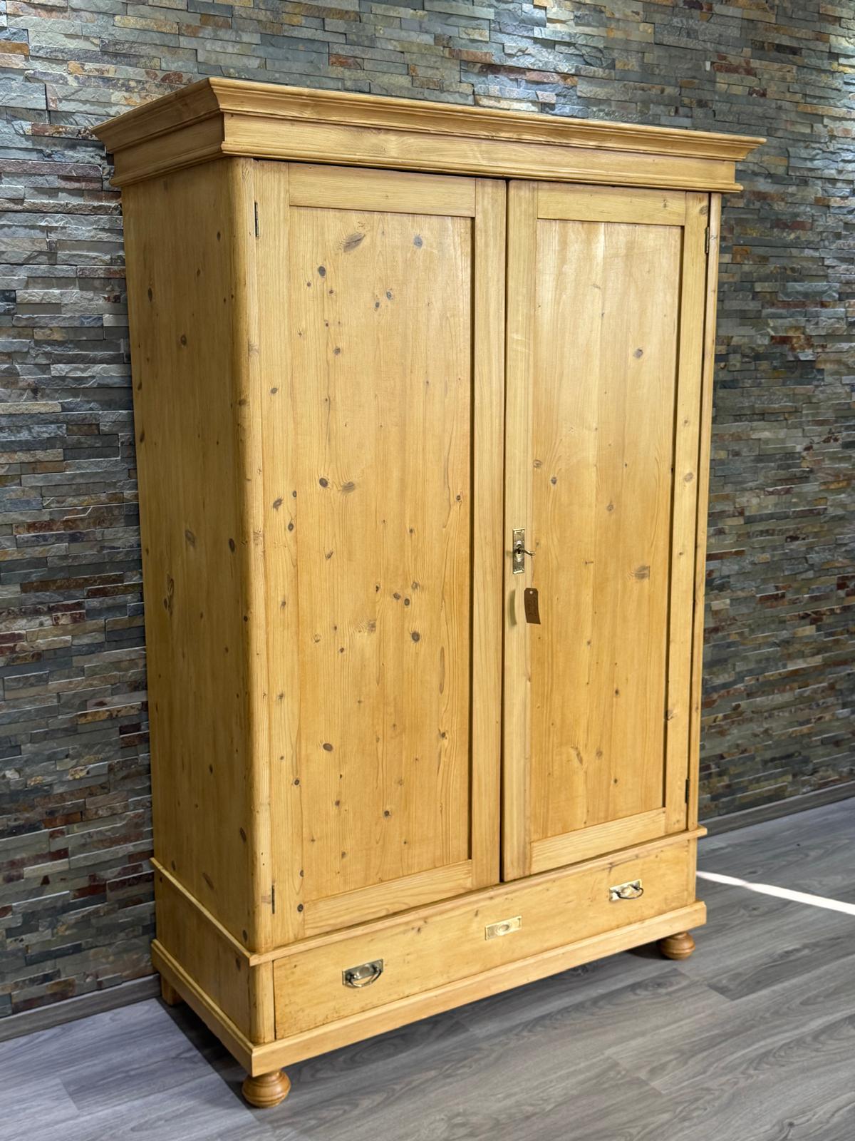 Ein schöner 2 Türiger Weichholz Schrank mit Innenausbau. Der Kleiderschrank hat ein Innenausbau mit einer Kle3iderstange und einem Regalboden. Unsere Weichholzmöbel sind zeitlos schön und ergänzen Ihre Inneneinrichtung. Die kleinen Gebrachsspuren sind bewusst gewollt und unterstreichen den Charakter des Möbels. Der Schrank ist komplett aus Massivholz. Jeder Schrank ist ein Unikat.