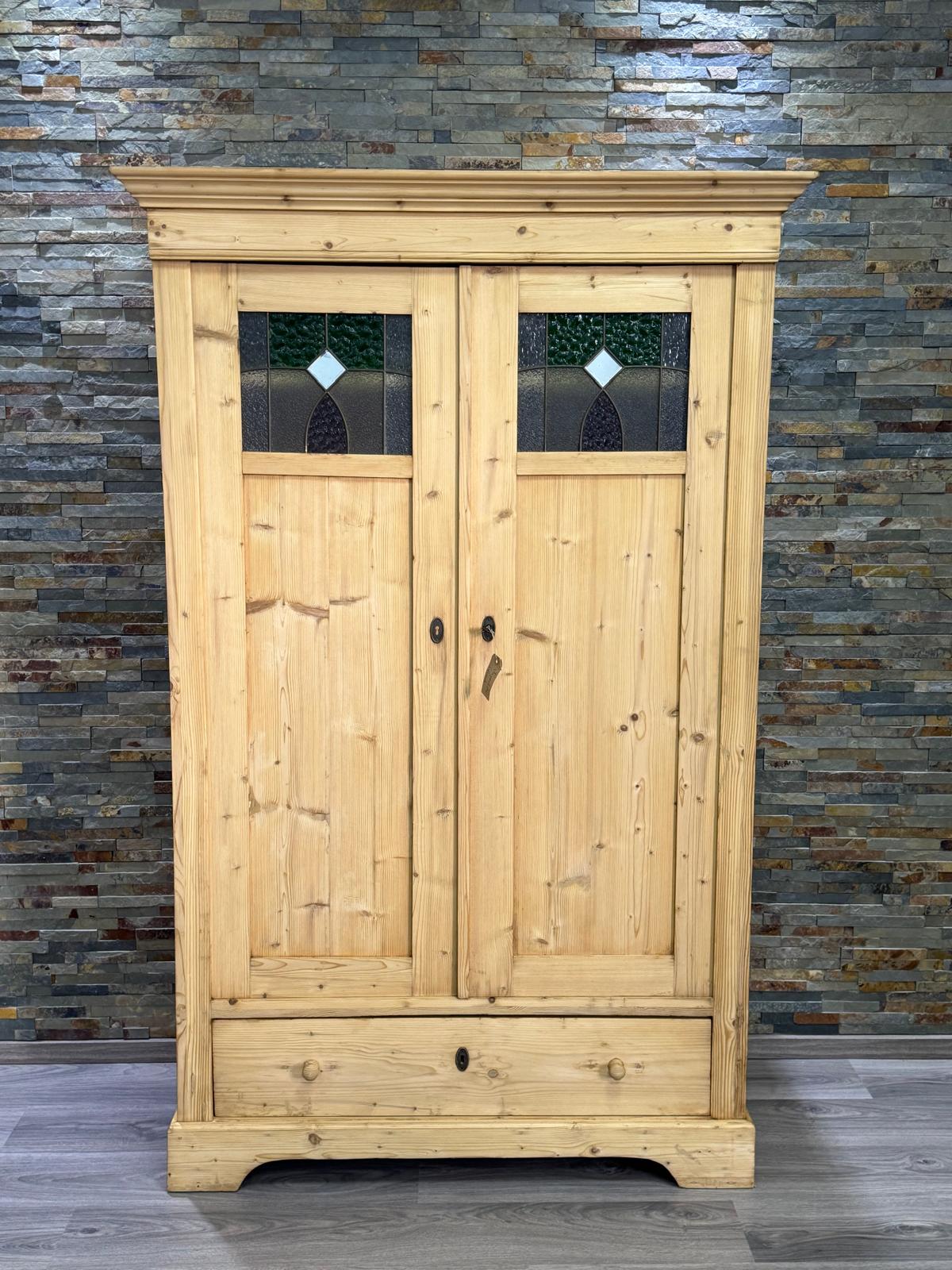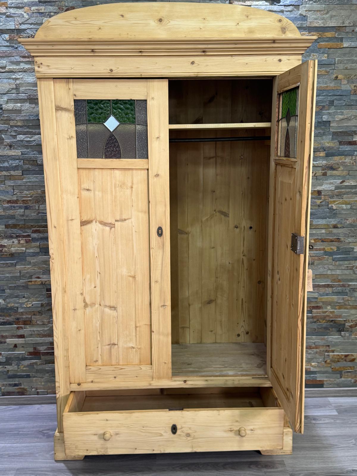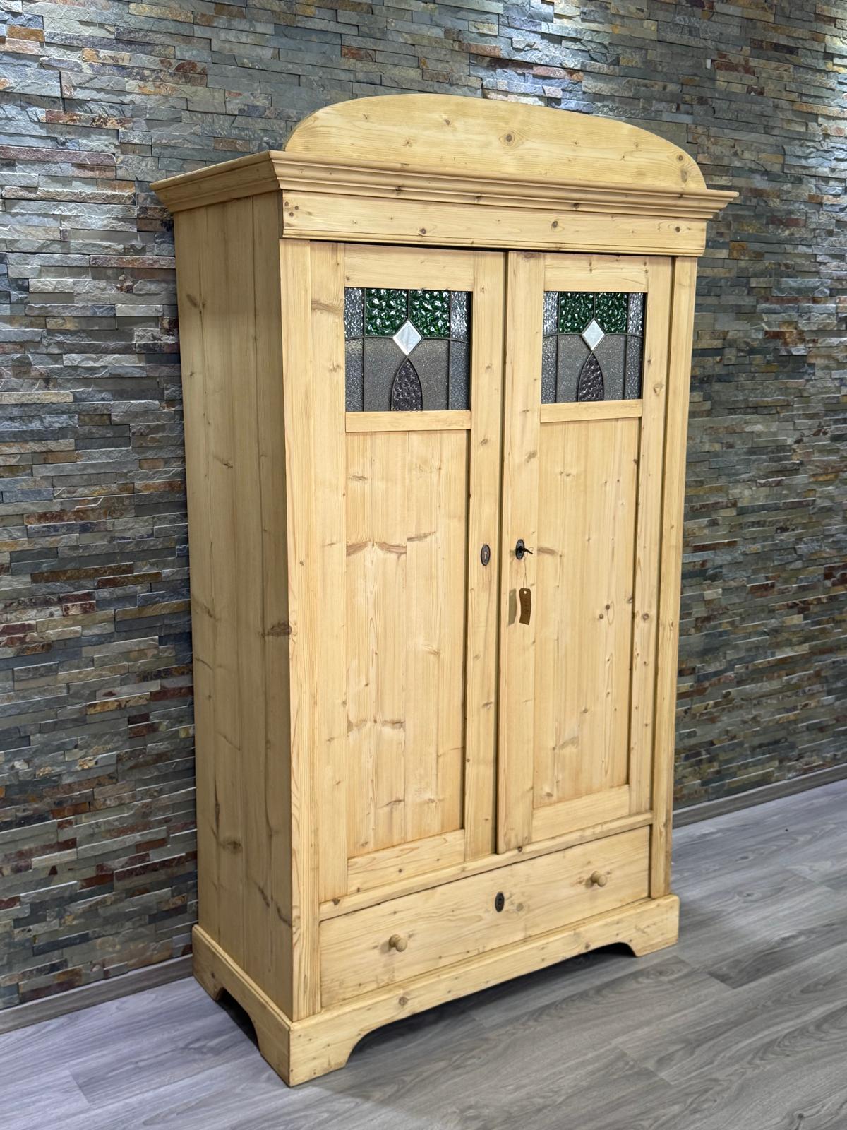 Ein schöner Jugendstil Schrank aus Weichholz. Ideal für das Kinderzimmer oder die Diele geeignet. Mit Innenausbau. Der Schrank ist sehr praktisch und bietet viel Stauraum an. Der Schrank ist in unserer Fachwerkstatt restauriert worden und befindet sich in einem guten wohnfertigem Zustand. Bitte beachten Sie, dass es sich um ein antikes Möbelstück handelt. Der Schrank wurde von traditionellen Handwerkern handgefertigt. Die vorhandenen Gebrauchspuren haben einen antiken Charakter und sind bewusst gewollt. Ein Schrank der Sie ein Leben lang begleiten wird! Die obere Kranzleiste ist abnehmbar.