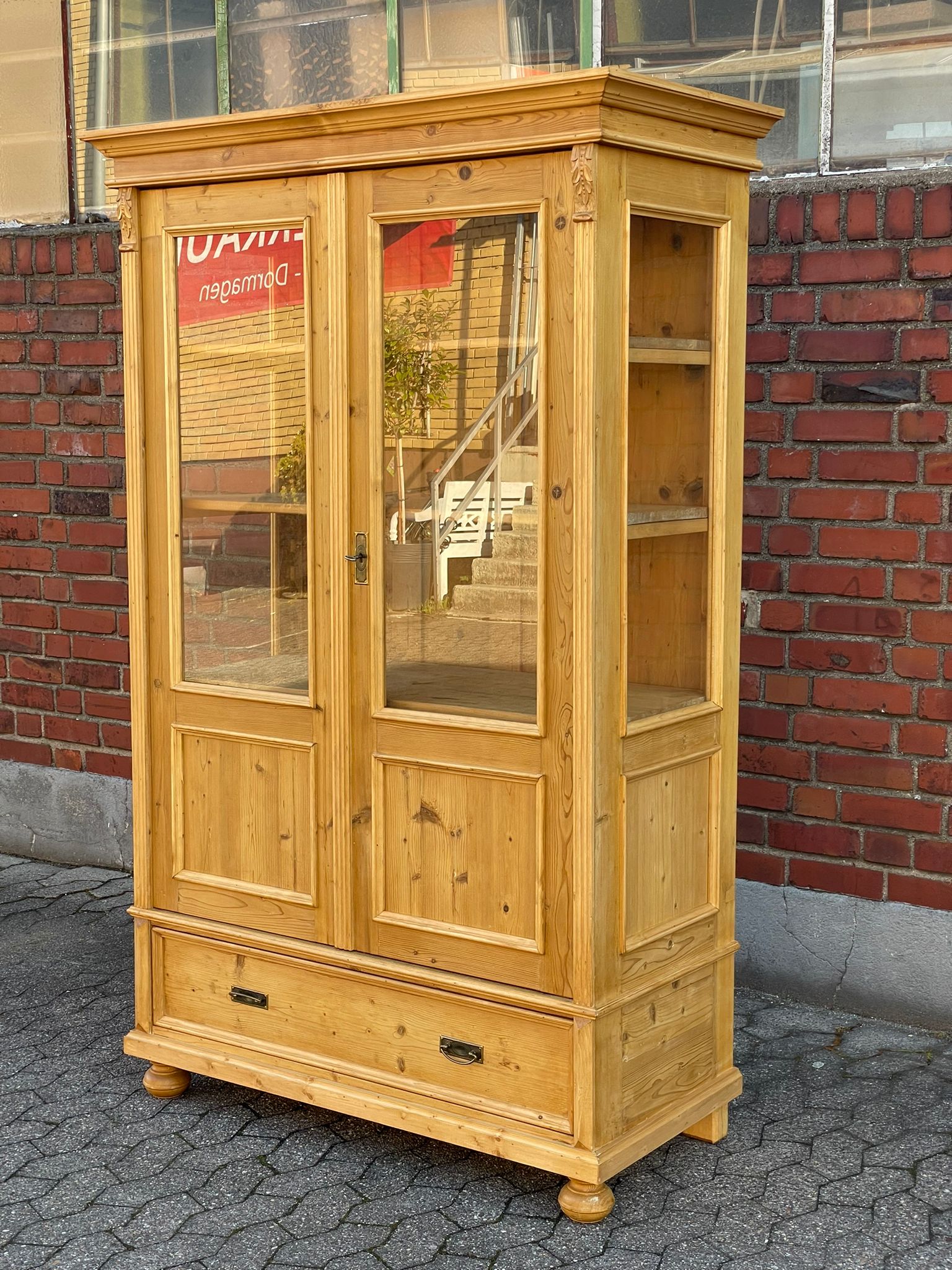 Ein schöner Jugendstil Vitrinenschrank. Die Vitrine wurde mit hochwertigem Antikwachs behandelt und aufpoliert. Der Innenausbau beinhaltet stabile Regalböden. Der Schrank ist in unserer Fachwerkstatt gefertigt worden und lässt Sich sofort in Ihrer Wohnung integrieren. Die Vitrine im angesagtem Landhaus-Stil ist ein hochwertiges, zeitloses Möbelstück, welches überall in Ihrem Haus einen prägenden Eindruck hinterlässt. Neben viel Stauraum in den Schubladen, lässt der obere Stauraum viel Platz für Ideen und dekorative Accessoires.