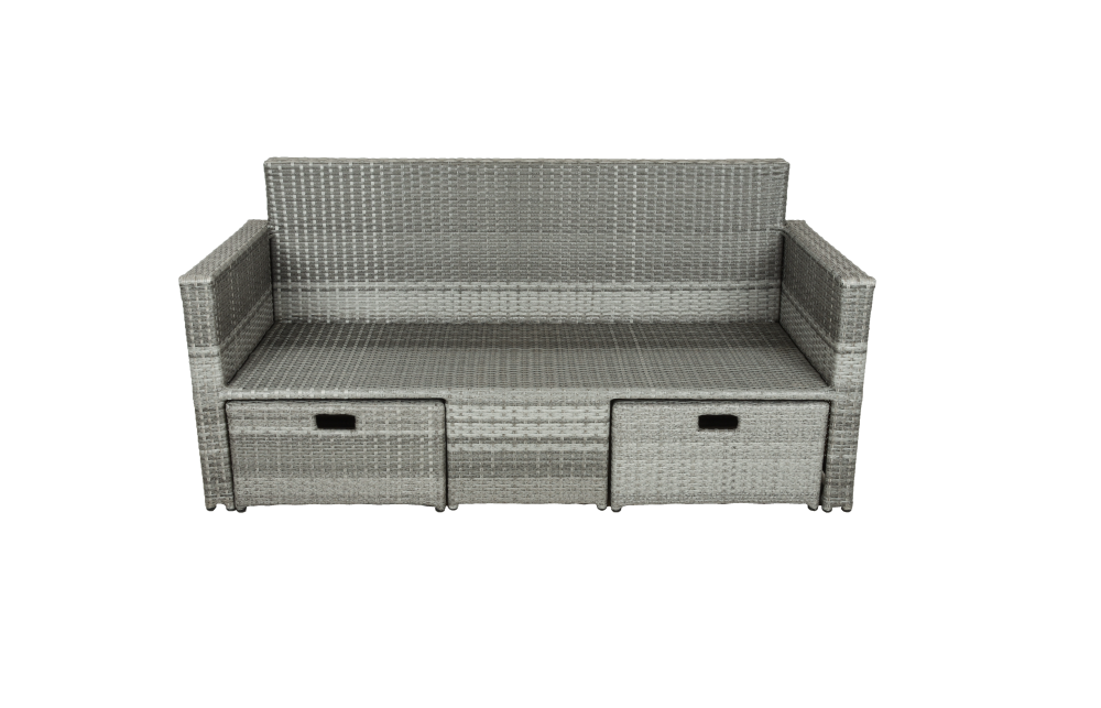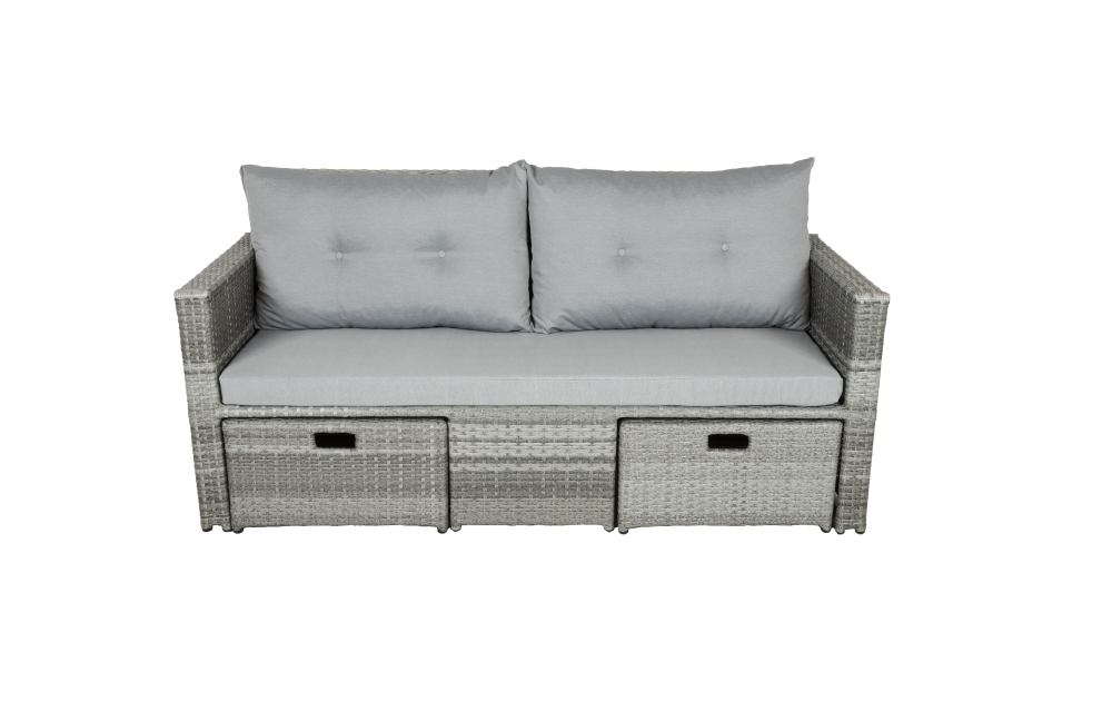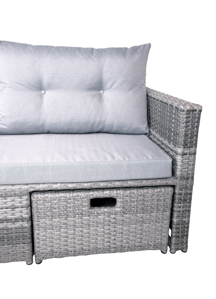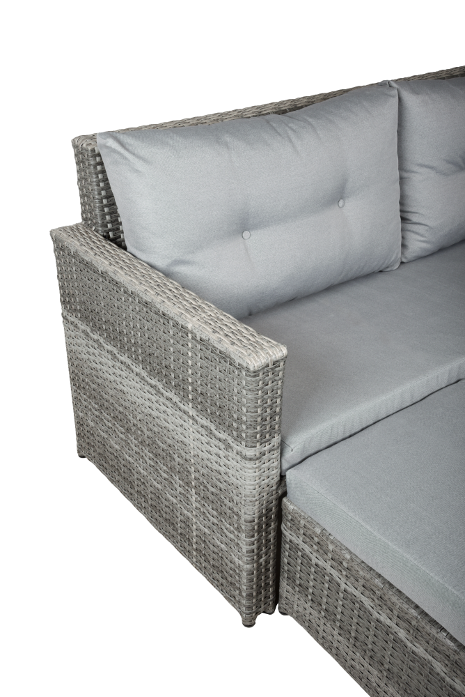 Die Lounge-Eckgruppe BAEZA ist eine stilvolle und gemütliche Sitzgruppe für den Outdoor-Bereich. Sie besteht aus einem großzügigen 3-Sitzer Sofa, einem bequemen Sessel und einem Fußhocker, die alle aus robustem dunkelgrauem Kunststoffgeflecht gefertigt sind. Zusammen mit dem Tisch bildet die Sitzgruppe eine perfekte Einheit für gemütliche Stunden im Freien.Der Tisch ist ebenfalls aus dunkelgrauem Stahl gefertigt und verfügt über eine elegante Glasplatte. Die Glasplatte sorgt für Standfestigkeit von Getränken, Snacks oder Dekorationsgegenständen, während das dezente Design für eine stilvolle Optik sorgt. Die Sitzpolster und Kissen in hellgrauer Farbe bieten einen bequemen und komfortablen Sitz, der zum Entspannen einlädt.Die Lounge-Eckgruppe BAEZA ist nicht nur funktional und bequem, sondern auch ein echter Hingucker für jeden Außenbereich. Ob auf der Terrasse oder im Garten - die Gruppe lässt sich flexibel einsetzen und bietet viel Platz für Freunde und Familie. Mit ihrer hochwertigen Verarbeitung und ihrem modernen Design wird die Lounge-Eckgruppe BAEZA zu einem echten Highlight in Ihrem Outdoor-Bereich. Die Abmessungen H/B/T: Sofa: 67/173/68 Hocker: 30/60/60 Sessel: 67/ 68/ 68 Tisch: 30/ 53/ 60 Inklusive 4 Rückenkissen + 5 Sitzauflagen 100% Polyester bei 30 Grad waschbar Stahlgestell Inklusive Hocker inklusive Sofatisch mit Glasplatte Kunststoffgeflecht Gewicht: 42,2kg Belastbarkeit je Sitz: 110kg Belastbarkeit Tisch: 25kg