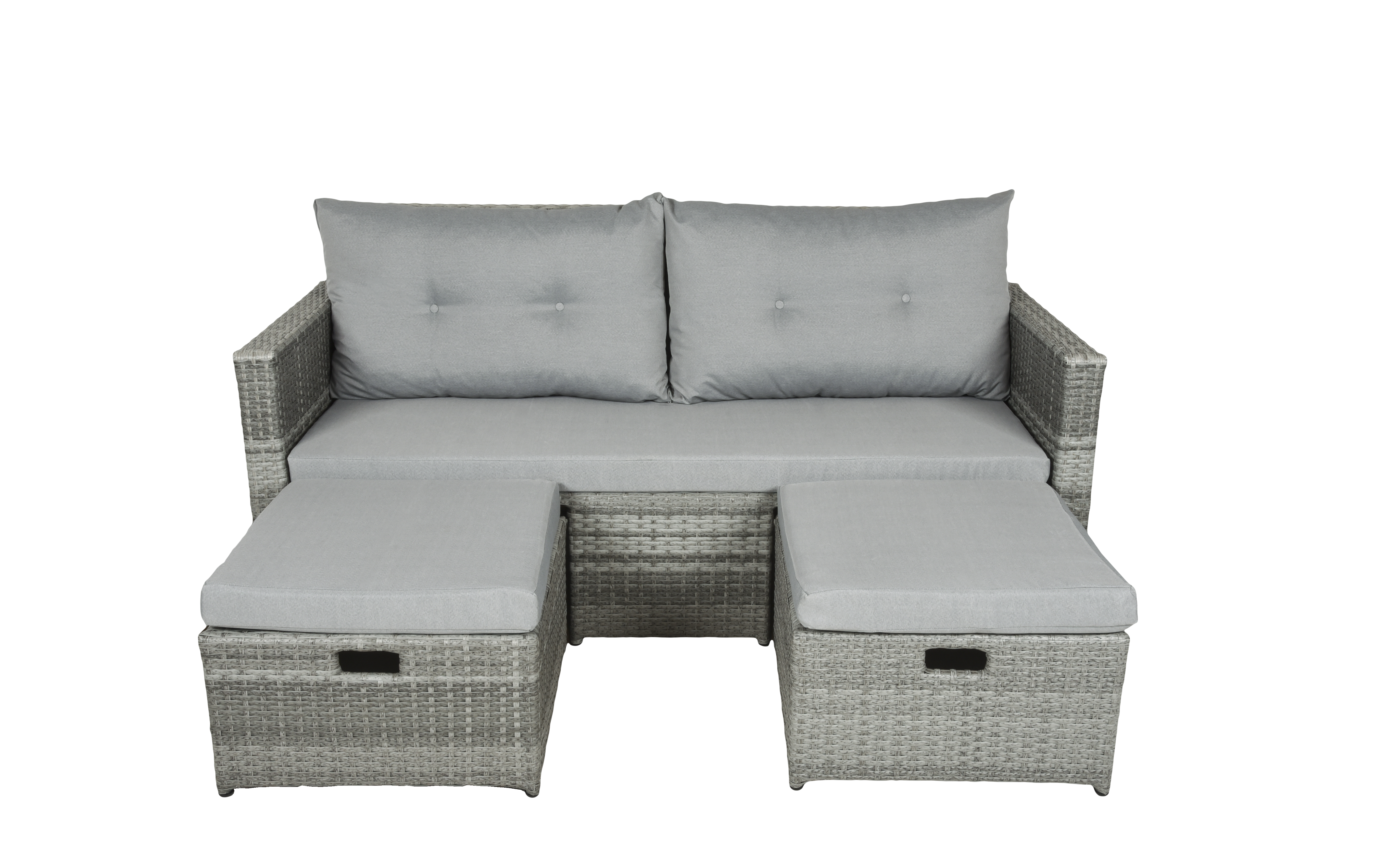 Das Lounge-Sofa Malta ist eine bequeme Sitzgelegenheit für zwei Personen. Das Gestell besteht aus Aluminium und Kunststoffgeflecht und die Kissenauflagen aus strapazierfähigem Polyester. Das zeitlose Design passt perfekt zu jeder Art von Inneneinrichtung oder Gartendesign. Die abnehmbaren und waschbaren Kissenbezüge ermöglichen eine einfache Reinigung.