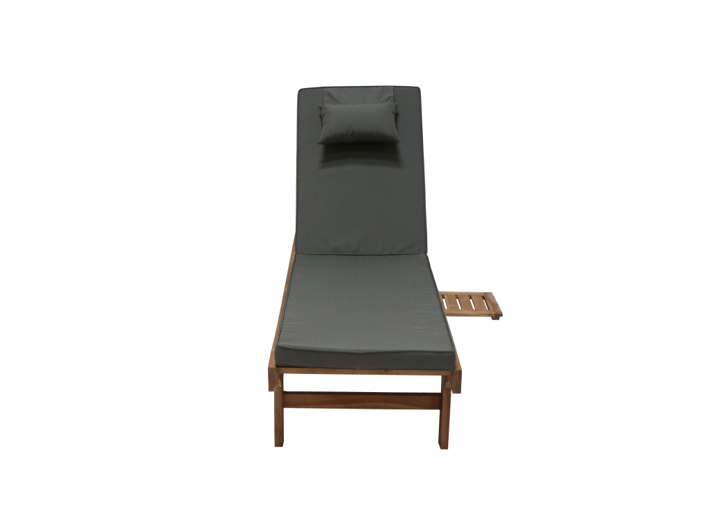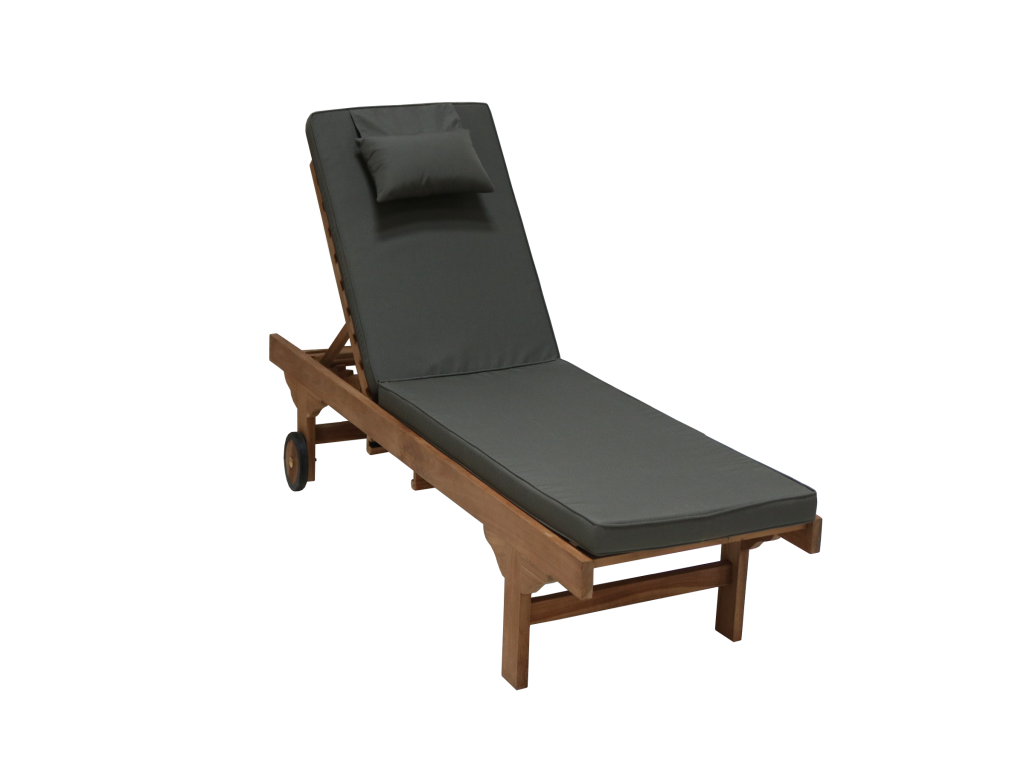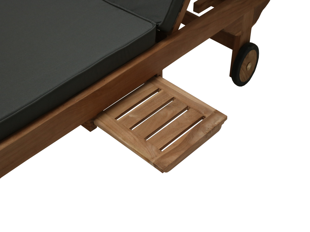 Eine schöne Lounge Gartenliege aus massivem Teakholz inklusive einer Auflage und einem Kissen, welche sehr komfortabel sind. Die hohe Qualität macht diese Gartenliege zum guten Begleiter, die Sonnenliege ist witterungsbeständig und kann somit auch bei Wind und Regen draußen stehen. Der eingebaute Tisch hat dazu die praktische Funktion, beispielsweise ein kaltes Getränk oder ein Buch abzustellen, sowie das Rad, welches dazu verhilft, diese Liege mit weniger Aufwand zu transportieren. Mit einer hohen Rückenlehne, die verstellbar ist, und einer breiten Sitzfläche ist diese Gartenliege für die Veranda, Balkon oder Terrasse ideal und bequem für langes Liegen. Entspannen und Sonnen wird Ihnen die perfekte Auszeit bieten!