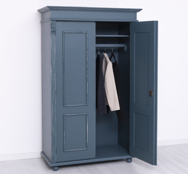 Ein romantischer Landhaus Schrank mit 2 Türen und Innenausbau. Seine robuste Konstruktion verspricht eine langanhaltende Nutzung. Die praktischen und eleganten Kleiderschränke bieten ausreichend Platz für alle Kleidungsstücke. Der Innenraum ist speziell für Kleiderbügel gestaltet, mit einer montierten Kleiderstange und einem festen Einlegeboden darüber. Sowohl das Regal als auch die Kleiderstange sind im Preis enthalten. Genießen Sie herausragende Qualität und ein beeindruckendes Design mit einem charakteristischen, eleganten Stil, der durch spezielle Ornamente unterstrichen wird.