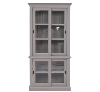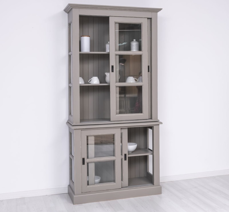 Diese Küchenvitrine bietet im oberen Teil hinter zwei Glasschiebetüren viel Präsentationsfläche sowie im unteren Teil hinter zwei kleinen Glasschiebetüren weitere großzügige Präsentationsflächen. Hier können Sie ihre Sammlerstücke und Lieblingsstücke präsentieren und vor Staub und Schmutz schützen. Die Seiten dieses Produkts bestehen aus Massivholzrahmen mit Glas, wodurch die Präsentationsfläche zusätzlich vergrößert wird.