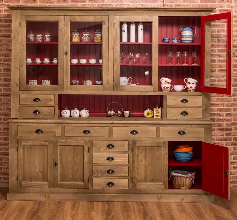 Dieser Küchenschrank wird aus 100 % Massivholz hergestellt. Die Vitrine bietet im oberen Teil hinter vier Glastüren viel Präsentationsfläche aber auch einen zentralen offenen Raum mit Regalen, sowie großzügigen Stauraum im unteren Teil. Das Produkt wird montiert in zwei separaten Paketen geliefert, die nur aufeinandergestellt werden müssen, und die sehr solide Konstruktion ermöglicht eine sehr lange Nutzung. Sie werden es Ihnen mit ihrer hervorragenden Qualität und ihrem beeindruckenden Design danken.