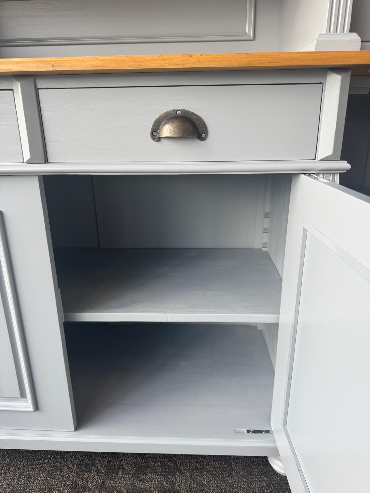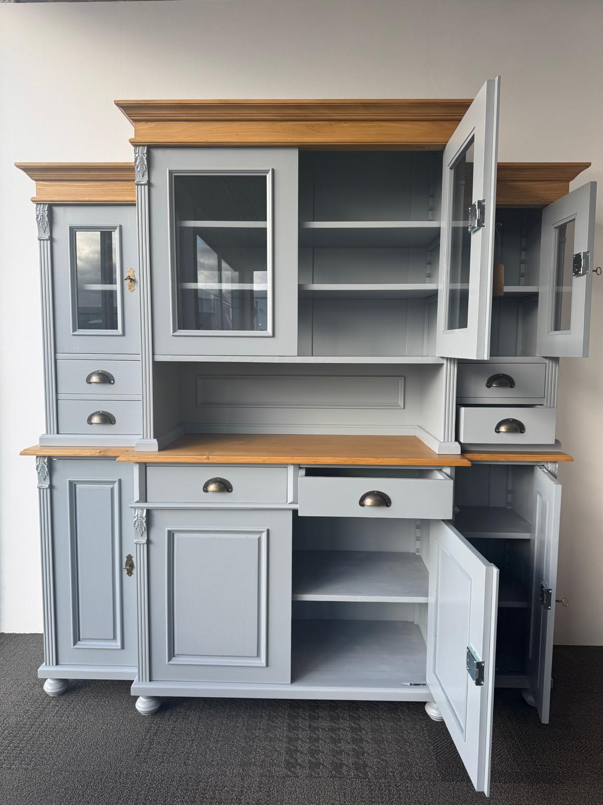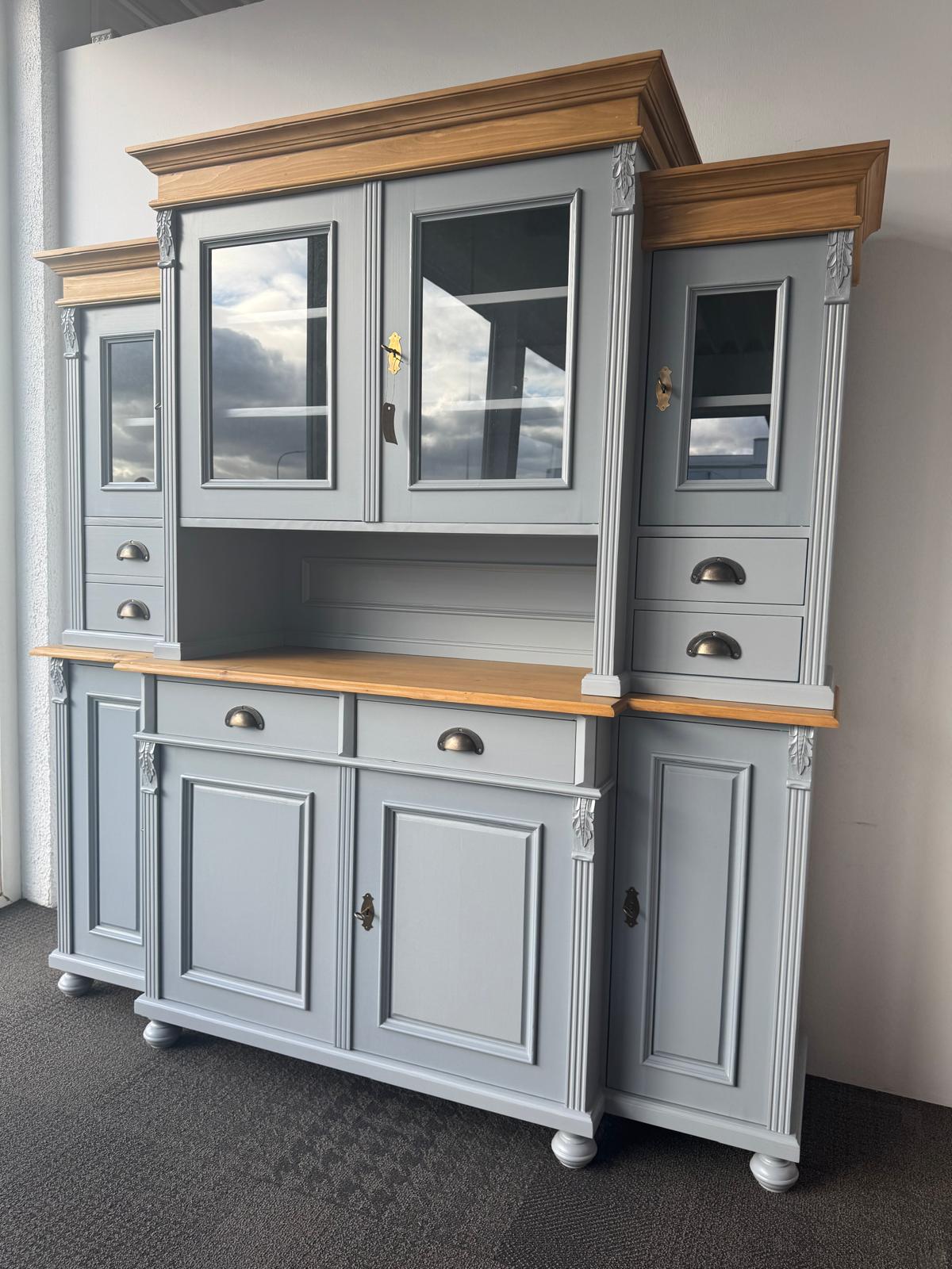 Ein großes Landhaus Buffet aus Massivholz mit großen Schubladen und schönen Muschelgriffen. Das 2-teilige Küchen Büffet wurde von Hand aufwendig und mit viel Liebe zum Detail hergestellt. Der Innenausbau beinhaltet stabile verstellbare Regalböden. Der Schrank ist aus Massivholz neu hergestellt. Farbe grau mit einer antikbraunen Arbeitsplatte und abgesetzten Holzelementen. Ein Massivholz Buffet im Landhaus Stil, welches überall in Ihrem Haus einen prägenden Eindruck hinterlässt. Neben viel Stauraum in den Schubladen, lässt der obere Stauraum viel Platz für Ideen und dekorative Accessoires.