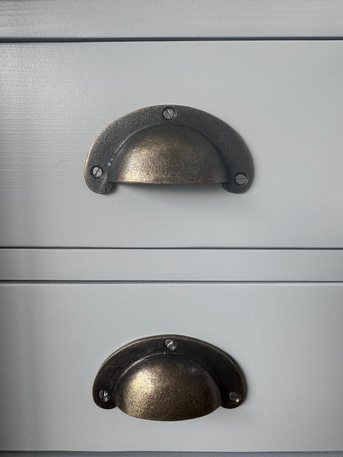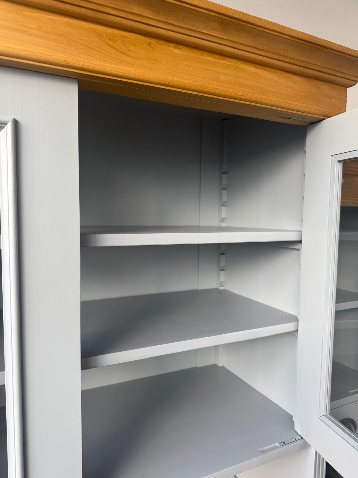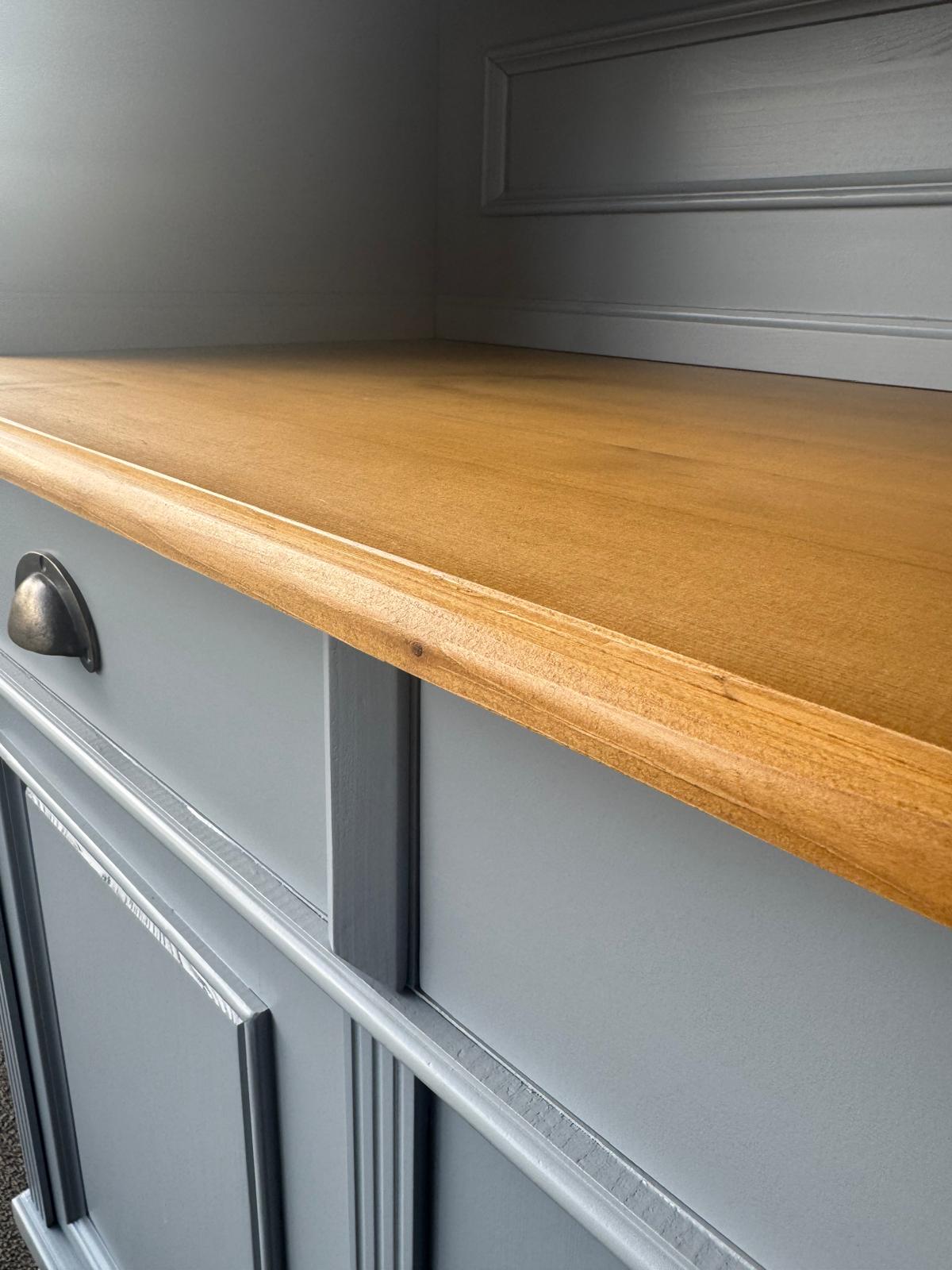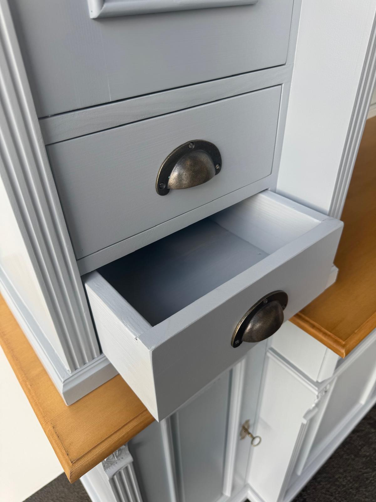 Ein großes Landhaus Buffet aus Massivholz mit großen Schubladen und schönen Muschelgriffen. Das 2-teilige Küchen Büffet wurde von Hand aufwendig und mit viel Liebe zum Detail hergestellt. Der Innenausbau beinhaltet stabile verstellbare Regalböden. Der Schrank ist aus Massivholz neu hergestellt. Farbe grau mit einer antikbraunen Arbeitsplatte und abgesetzten Holzelementen. Ein Massivholz Buffet im Landhaus Stil, welches überall in Ihrem Haus einen prägenden Eindruck hinterlässt. Neben viel Stauraum in den Schubladen, lässt der obere Stauraum viel Platz für Ideen und dekorative Accessoires.