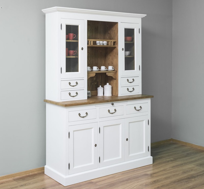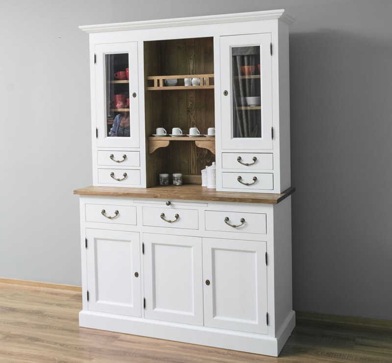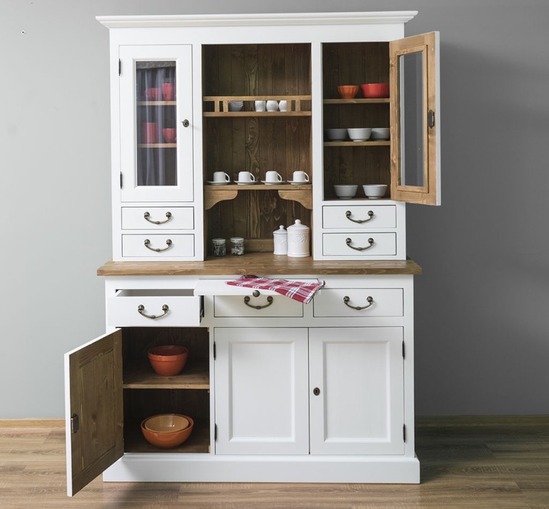 Dieser Küchenschrank wird aus 100 % Massivholz hergestellt. Die Vitrine bietet im oberen Teil hinter zwei Glastüren viel Präsentationsfläche aber auch einen zentralen offenen Raum mit Regalen, sowie großzügigen Stauraum im unteren Teil. Das Produkt wird montiert in zwei separaten Paketen geliefert, die nur aufeinandergestellt werden müssen, und die sehr solide Konstruktion ermöglicht eine sehr lange Nutzung. Sie werden es Ihnen mit ihrer hervorragenden Qualität und ihrem beeindruckenden Design danken.
