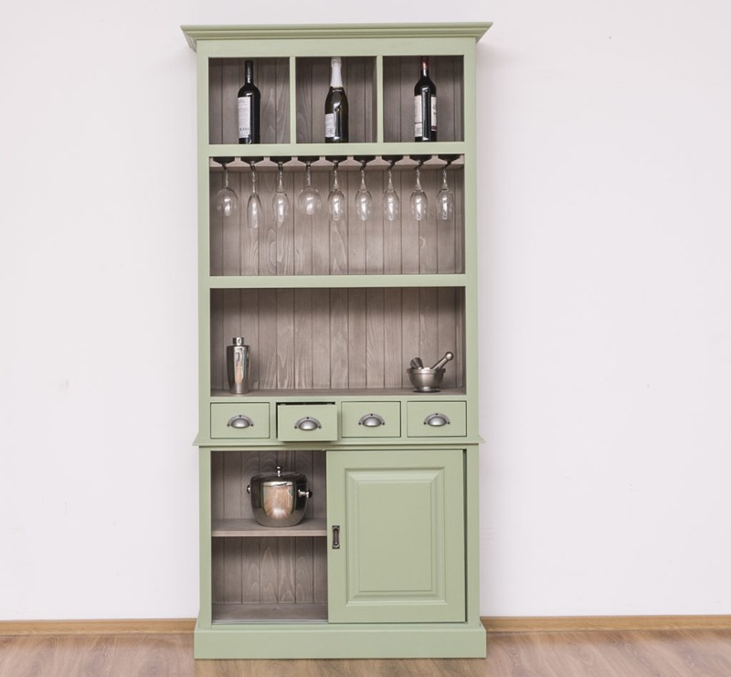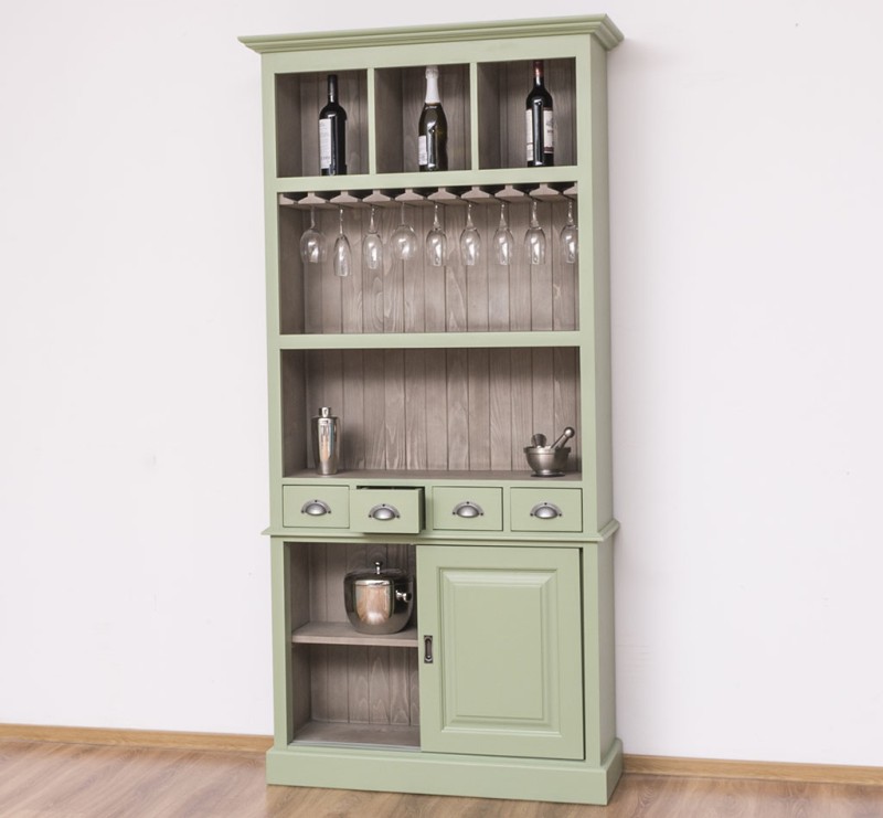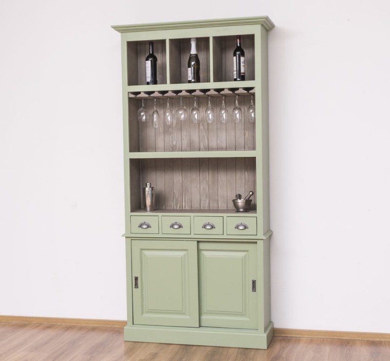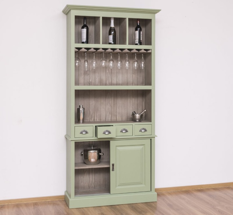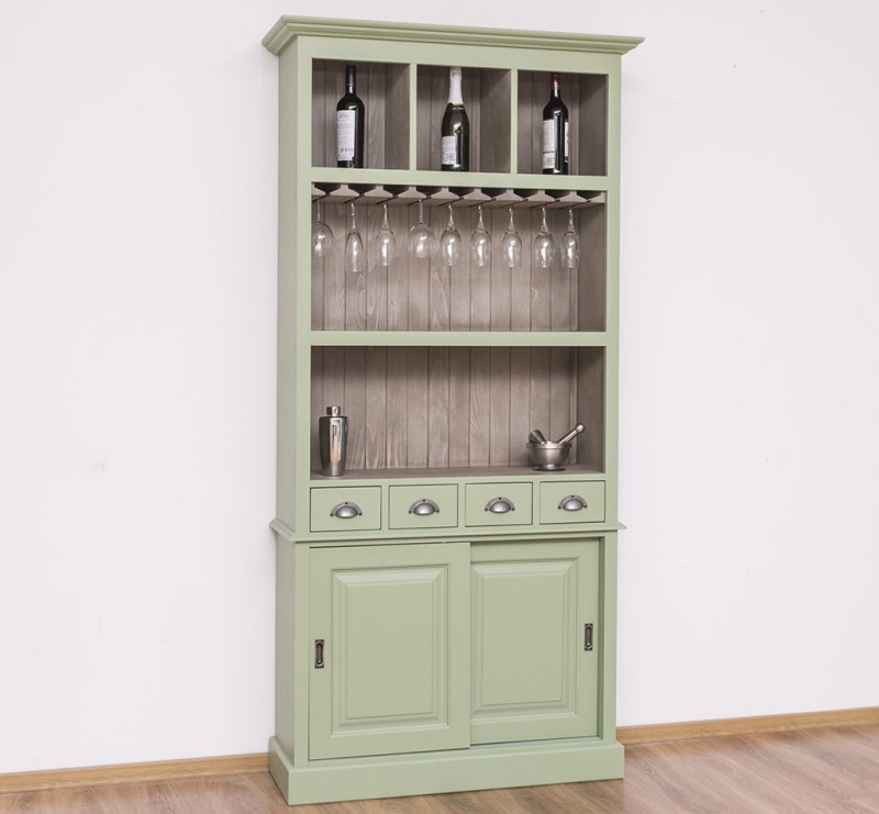 Dieser Barschrank im Landhausstil ist ein hochwertiges, zeitloses Möbelstück, welches in Ihrem Haus einen prägenden Eindruck hinterlässt und eine gute Figur macht. Das Möbelstück vereint auf elegante Weise Funktionalität und Ästhetik. Es bietet Stauraum hinter zwei Schiebetüren im unteren Bereich, sowie in den vier Schubladen. Zusätzlich bietet es im oberen Teil mit zwei festen Regalen, einem Glasauflageboden und drei Fächern für Flaschen eine großzügige Präsentationsfläche.