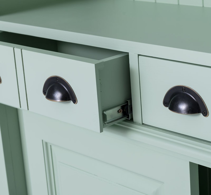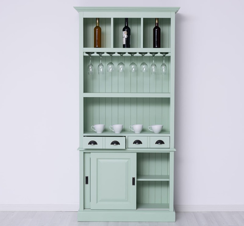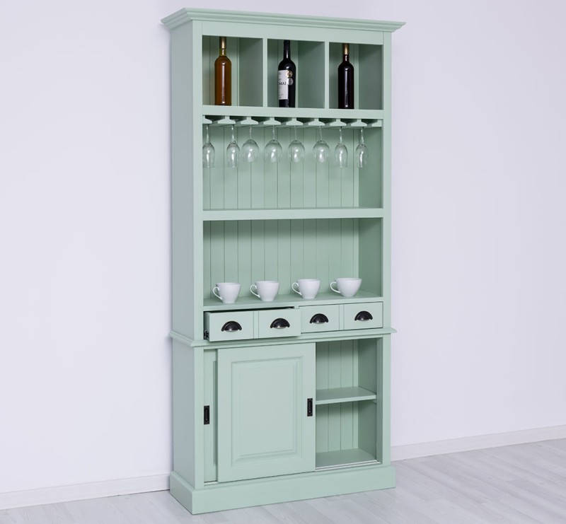 Dieser Barschrank im Landhausstil ist ein hochwertiges, zeitloses Möbelstück, welches in Ihrem Haus einen prägenden Eindruck hinterlässt und eine gute Figur macht. Das Möbelstück vereint auf elegante Weise Funktionalität und Ästhetik. Es bietet Stauraum hinter zwei Schiebetüren im unteren Bereich, sowie in den vier Schubladen. Zusätzlich bietet es im oberen Teil mit zwei festen Regalen, einem Glasauflageboden und drei Fächern für Flaschen eine großzügige Präsentationsfläche.