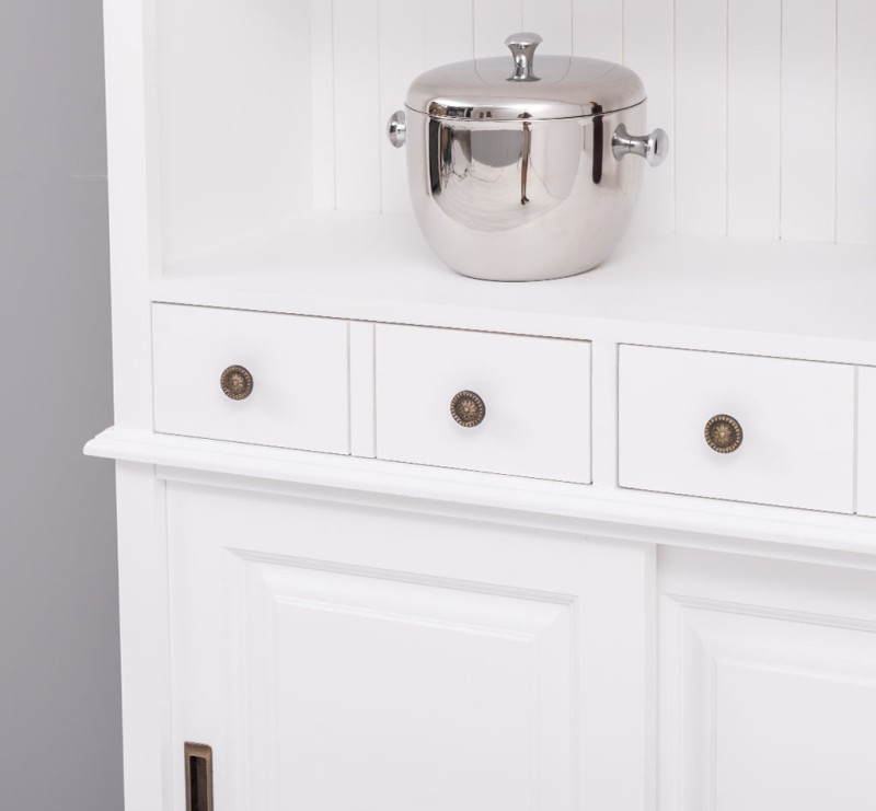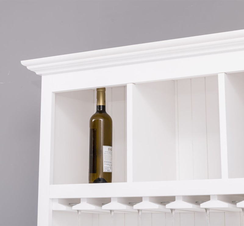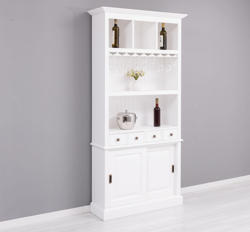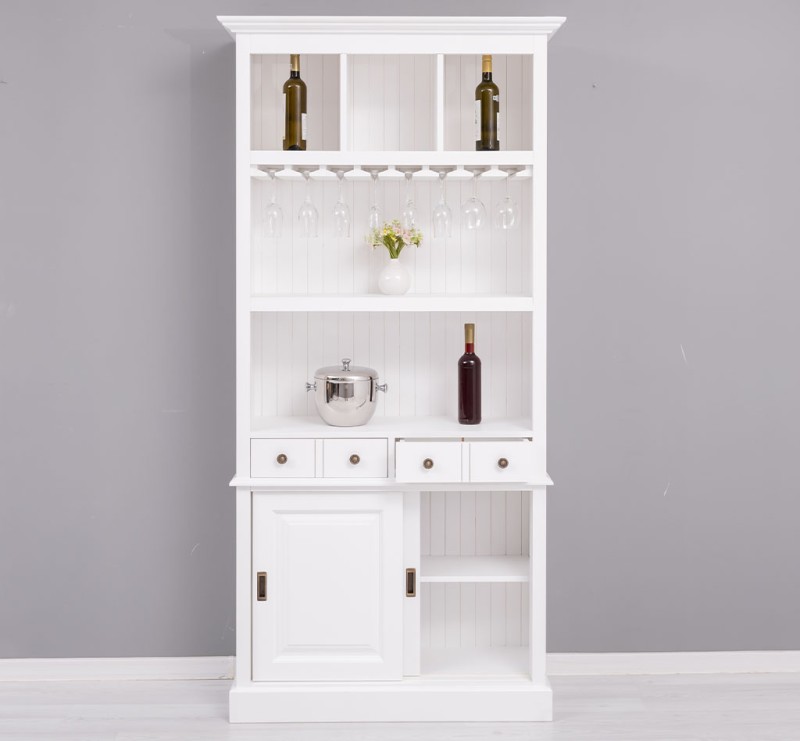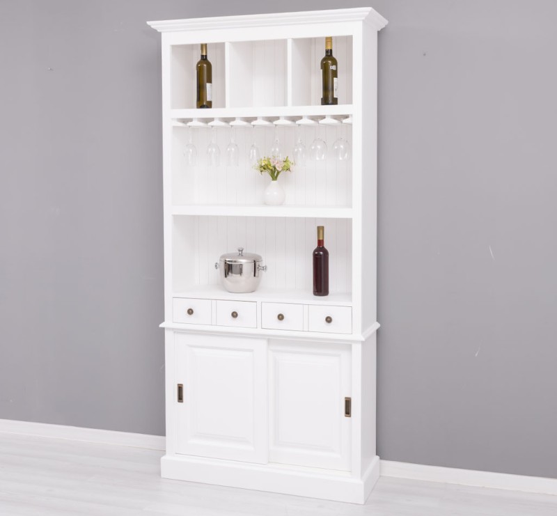 Dieser Barschrank im Landhausstil ist ein hochwertiges, zeitloses Möbelstück, welches in Ihrem Haus einen prägenden Eindruck hinterlässt und eine gute Figur macht. Das Möbelstück vereint auf elegante Weise Funktionalität und Ästhetik. Es bietet Stauraum hinter zwei Schiebetüren im unteren Bereich, sowie in den vier Schubladen. Zusätzlich bietet es im oberen Teil mit zwei festen Regalen, einem Glasauflageboden und drei Fächern für Flaschen eine großzügige Präsentationsfläche.