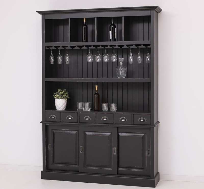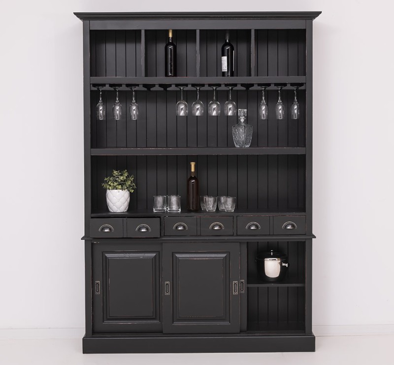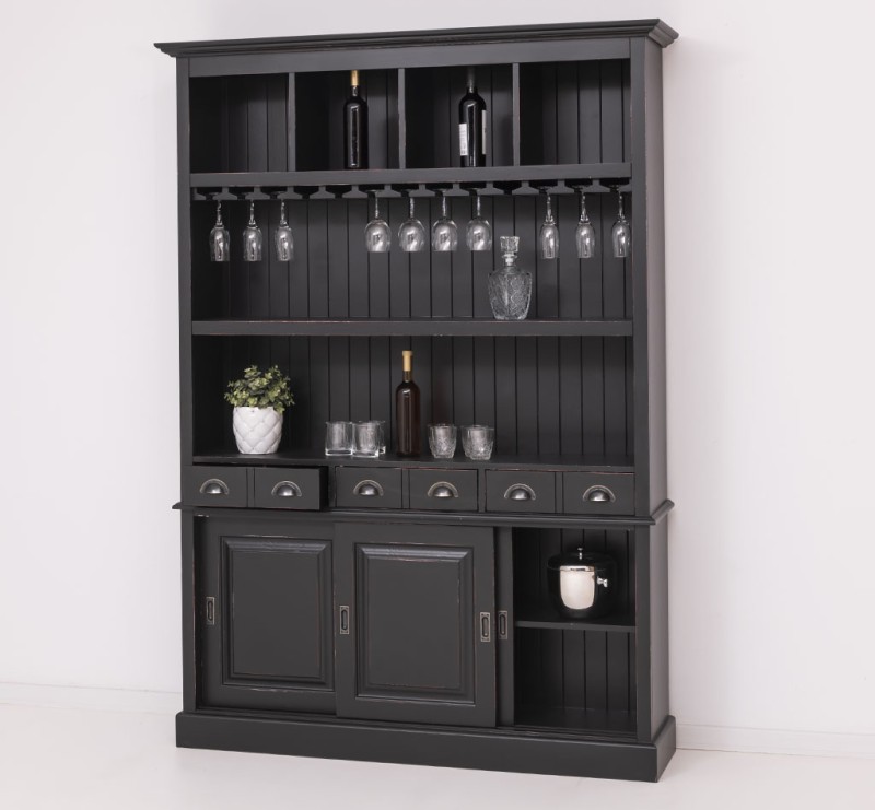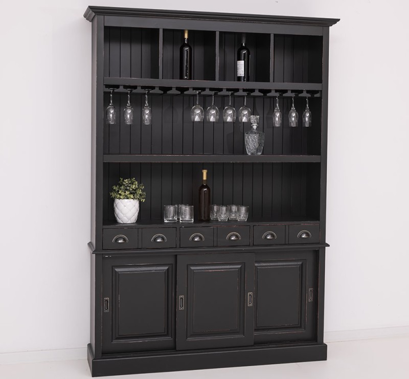Dieser Barschrank im Landhausstil ist ein hochwertiges, zeitloses Möbelstück, welches in Ihrem Haus einen prägenden Eindruck hinterlässt und eine gute Figur macht. Das Möbelstück vereint auf elegante Weise Funktionalität und Ästhetik. Es bietet Stauraum hinter drei Schiebetüren im unteren Bereich, sowie in den sechs Schubladen. Zusätzlich bietet es im oberen Teil mit zwei festen Regalen, einem Glasauflageboden und vier Fächern für Flaschen eine großzügige Präsentationsfläche.