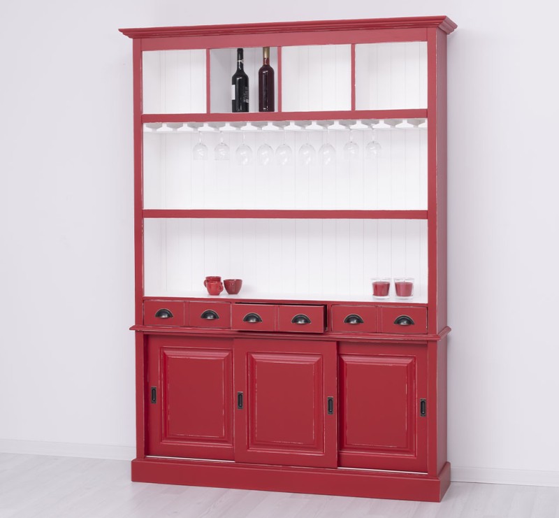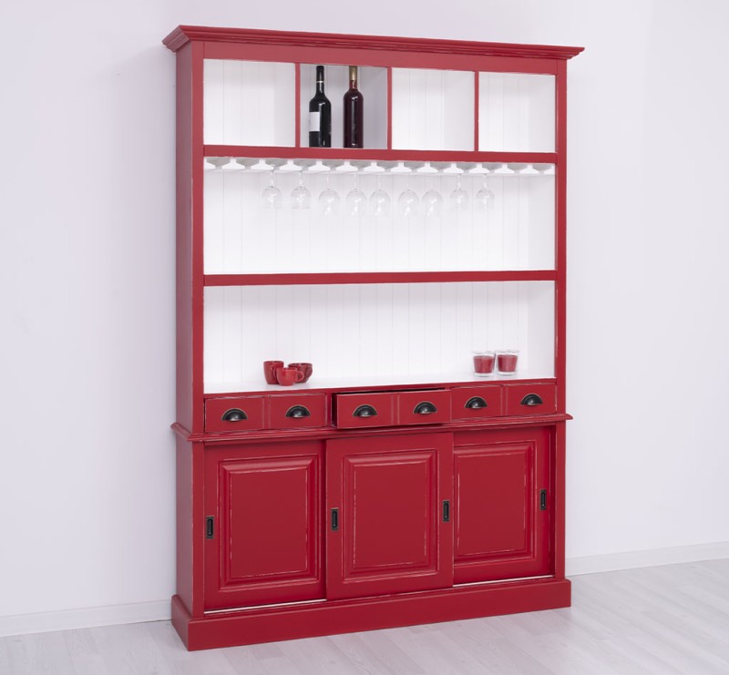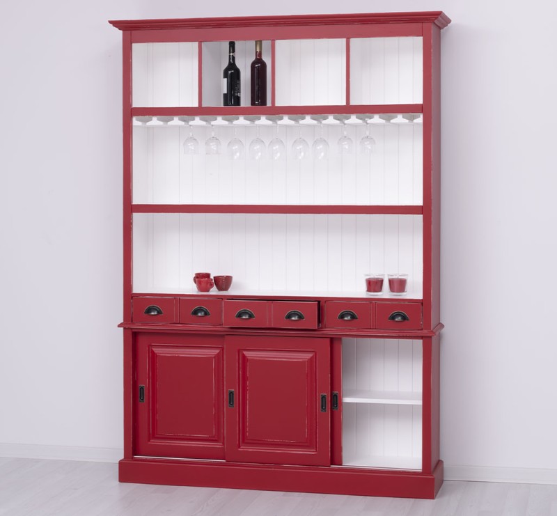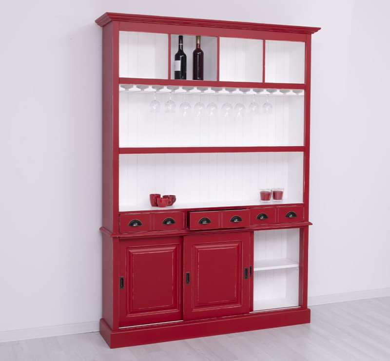Dieser Barschrank im Landhausstil ist ein hochwertiges, zeitloses Möbelstück, welches in Ihrem Haus einen prägenden Eindruck hinterlässt und eine gute Figur macht. Das Möbelstück vereint auf elegante Weise Funktionalität und Ästhetik. Es bietet Stauraum hinter drei Schiebetüren im unteren Bereich, sowie in den sechs Schubladen. Zusätzlich bietet es im oberen Teil mit zwei festen Regalen, einem Glasauflageboden und vier Fächern für Flaschen eine großzügige Präsentationsfläche.