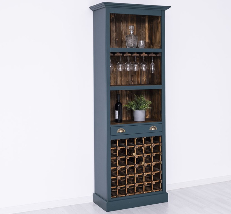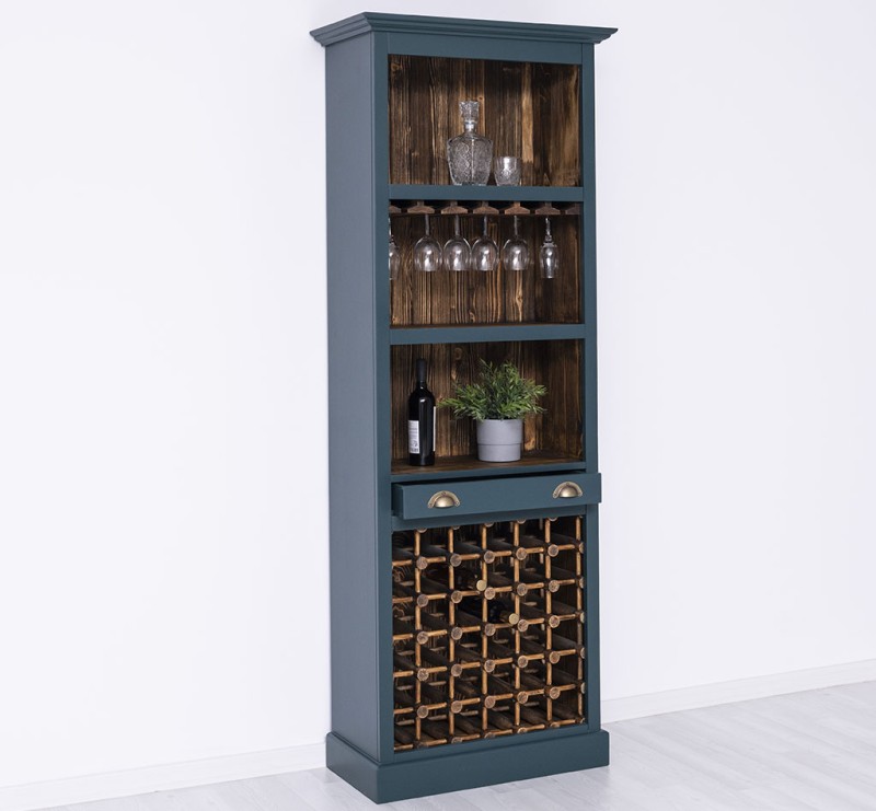 Dieser Barschrank im Landhausstil ist ein hochwertiges, zeitloses Möbelstück, welches in Ihrem Haus einen prägenden Eindruck hinterlässt und eine gute Figur macht. Das Möbelstück vereint auf elegante Weise Funktionalität und Ästhetik. Es bietet Stauraum in einer großen Schublade und bietet viel Platz für ihre Weinflaschen im unteren Teil. Zusätzlich bietet es im oberen Teil mit zwei Glasauflageböden und einem offenen Fach großzügige Präsentationsfläche. Das Design dieses Möbelstücks strahlt zeitlose Eleganz aus und passt sich nahtlos in verschiedene Einrichtungsstile ein. Es ist das perfekte Highlight für diejenigen, die sowohl praktische Lösungen als auch raffinierten Stil suchen. Mit seiner exzellenten Verarbeitung garantiert dieser Schrank Langlebigkeit und Beständigkeit. Er überzeugt nicht nur mit praktischen Lösungen, sondern wird auch Ihre Freude und Bewunderung langfristig erhalten. Abmessungen: H: 210 cm, B: 78 cm, T: 41 cm Korpusfarbe - frei wählbar Innenfarbe - frei wählbar Massivholz Möbel Korpus 100% Kiefernholz Beschläge/Griffe wählbar Schublade mit Soft-Close Landhausstil Fertig montiert - 1-Teil Oberflächen und Farben sind frei wählbar. 36 Farben und 8 Oberflächen (lackiert/gewachst/natur usw.) - Andere Abmessungen und Sonderanfertigungen sind möglich. Bitte Fragen Sie uns.