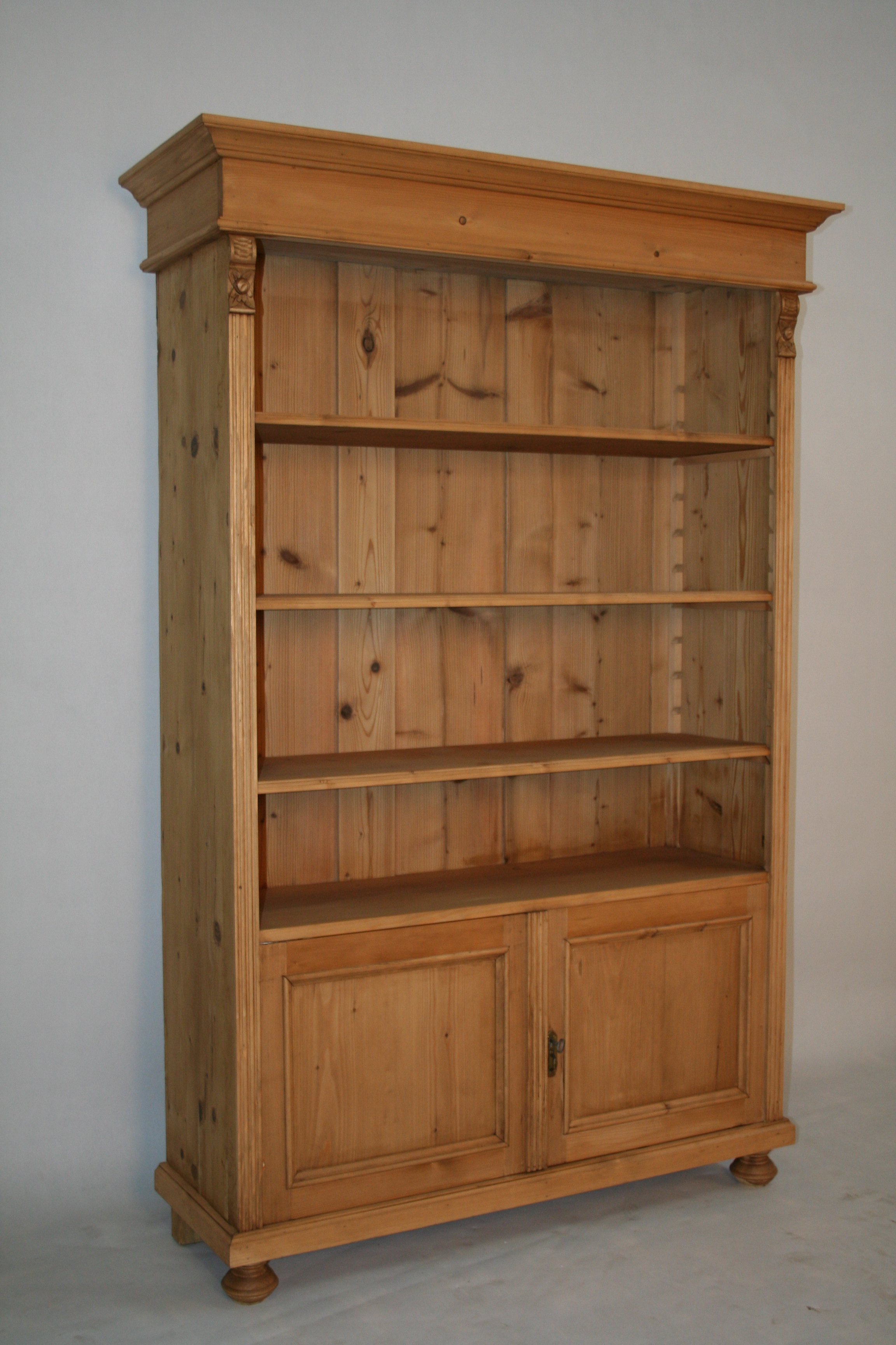 Ein Bücherregal aus Weichholz im Landhausstil. Ein tolles Regal für Ihre Bücher und Accessoires. Das Regal hat zwei abschließbare Türen für zusätzlichen Stauraum. Bitte beachten Sie, dass es sich um ein antikes Möbelstück handelt. Ein alter Schrank wurde zum Regal umgebaut. Mit verstellbaren Fachböden ausgebaut. Die vorhandenen Gebrauchsspuren haben einen antiken Charakter und sind bewusst gewollt. Ein praktisches und zugleich schönes Regal für Ihr zuhause.