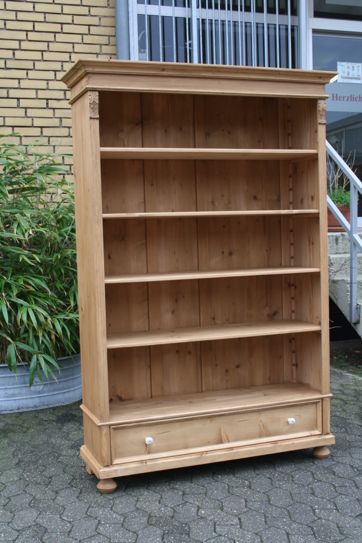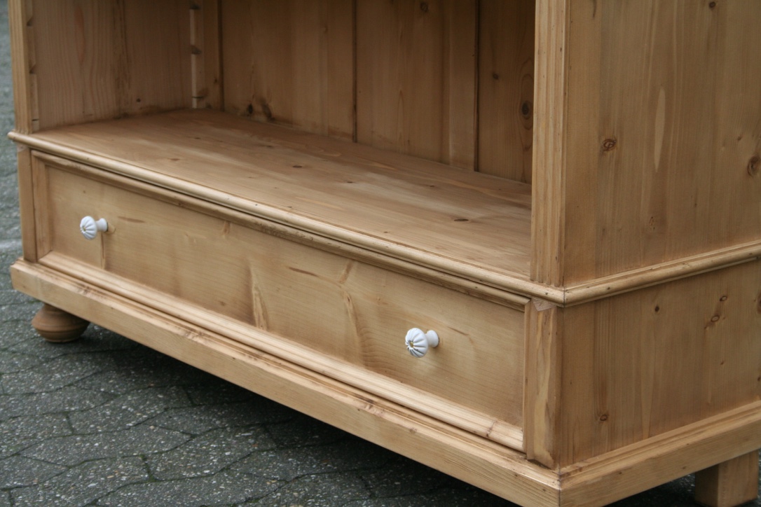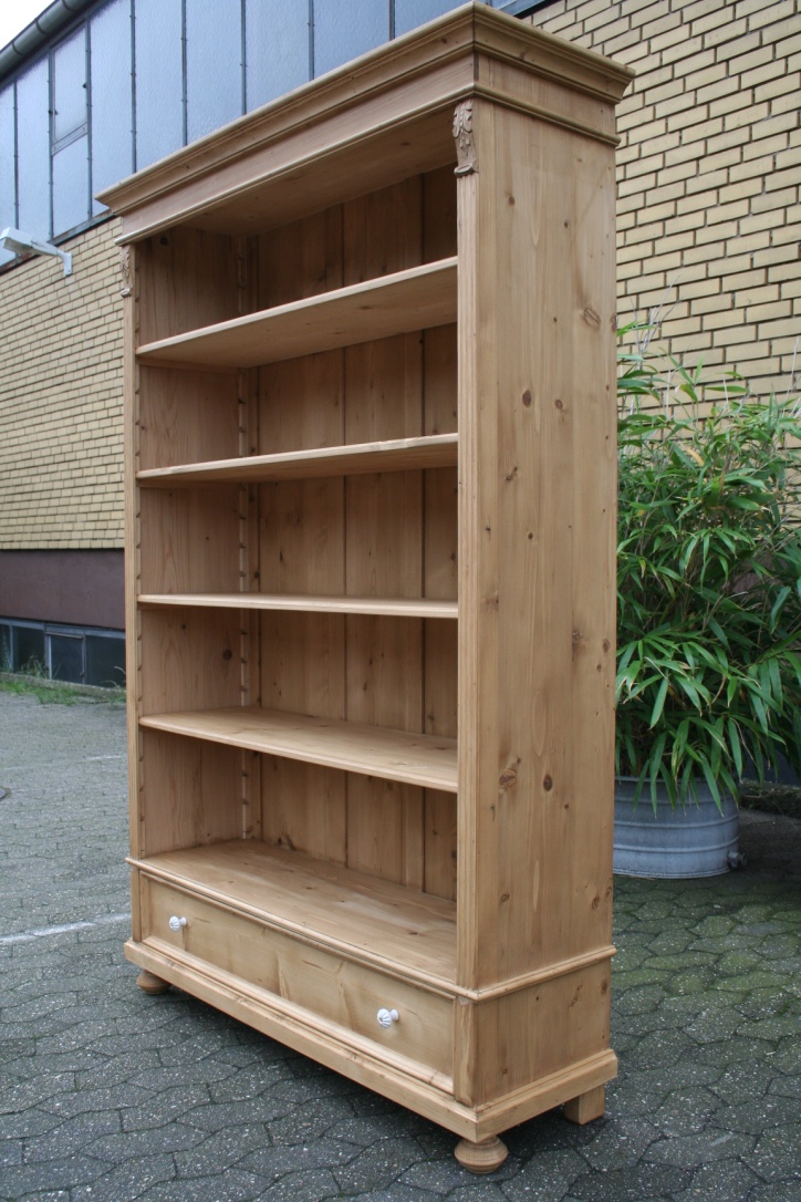 Ein schönes Bücherregal aus massivem Weichholz. Das Regal hat eine Schublade mit schönen Porzellanknöpfen. Die Regalböden sind individuell verstellbar. Mit natürlichen Wachs von Hand bearbeitet und poliert. Das Regal wurde aus einen alten original Schrank umgebaut und hat dadurch seinen antiken Charakter. Das schöne Weichholz Regal wird Ihr Eigenheim in neuem Glanz erstrahlen lassen. Die leichten Gebrauchsspuren haben einen antiken Charakter und sind bewusst gewollt.