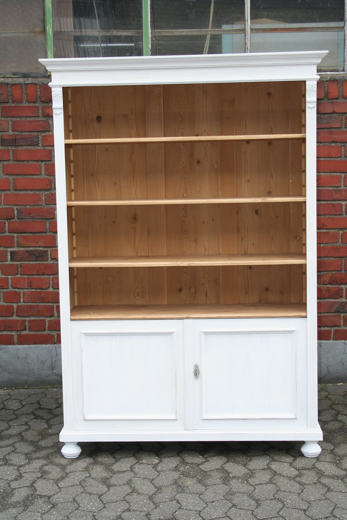 Ein schönes Regal in shabby chic weiß gestrichen. Mit praktischen, höhenverstellbaren Einlegeböden und zwei großen Türen. Die Regalböden und Innenwände sind farblich abgehoben und naturbelassen. Mit einer geraden Krone.