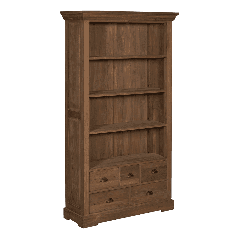 Dieses Bologna Bücherregal 111 cm wird auf traditionelle Weise aus 100% recyceltem Teakholz hergestellt. Das sorgfältig ausgewählte Altholz sorgt für ein schönes natürliches und ländliches Erscheinungsbild. Dieses Möbelstück enthält drei Regale und fünf Schubladen, sodass Sie genügend Bücher darin aufbewahren können.