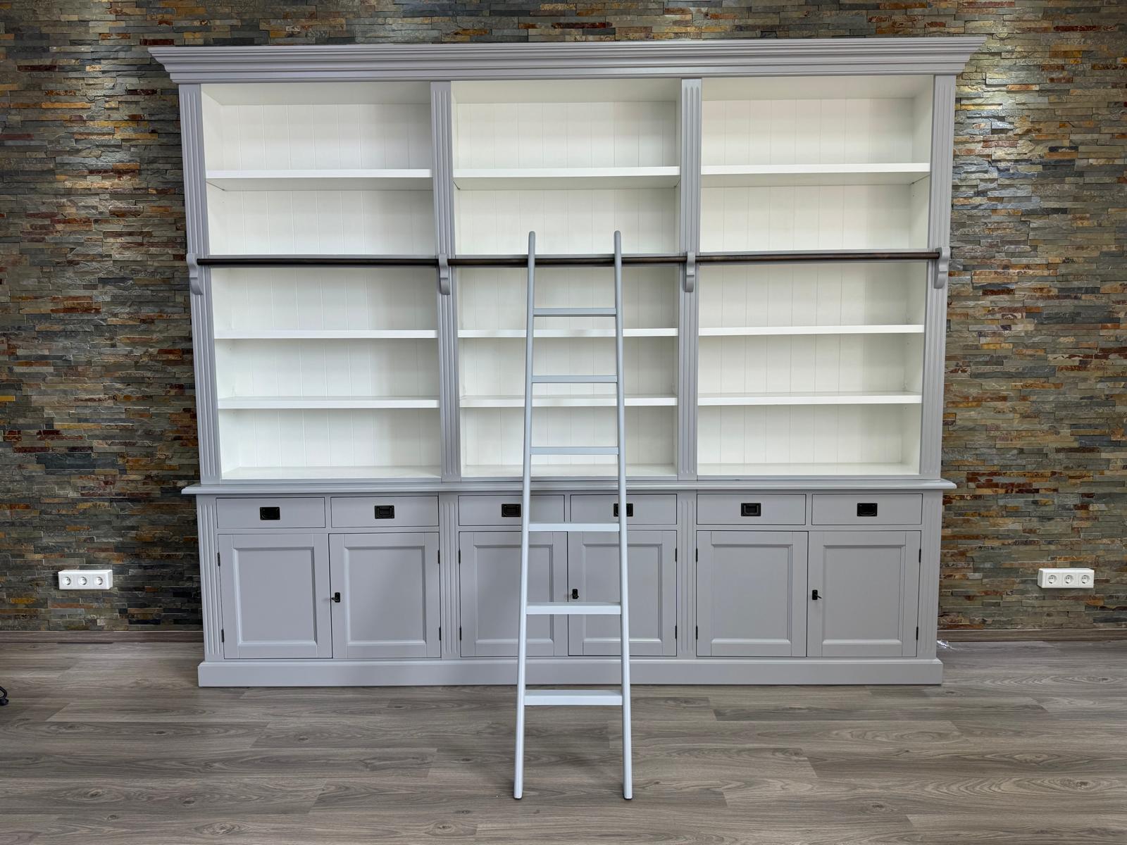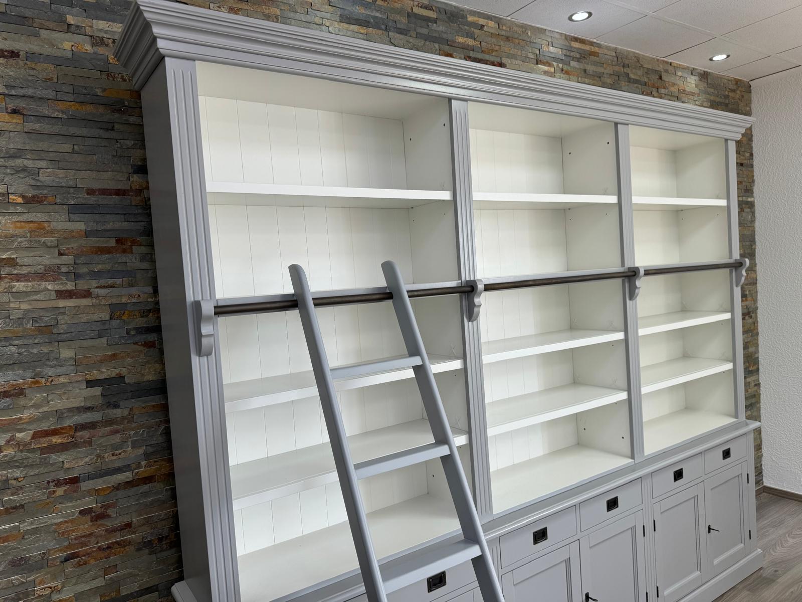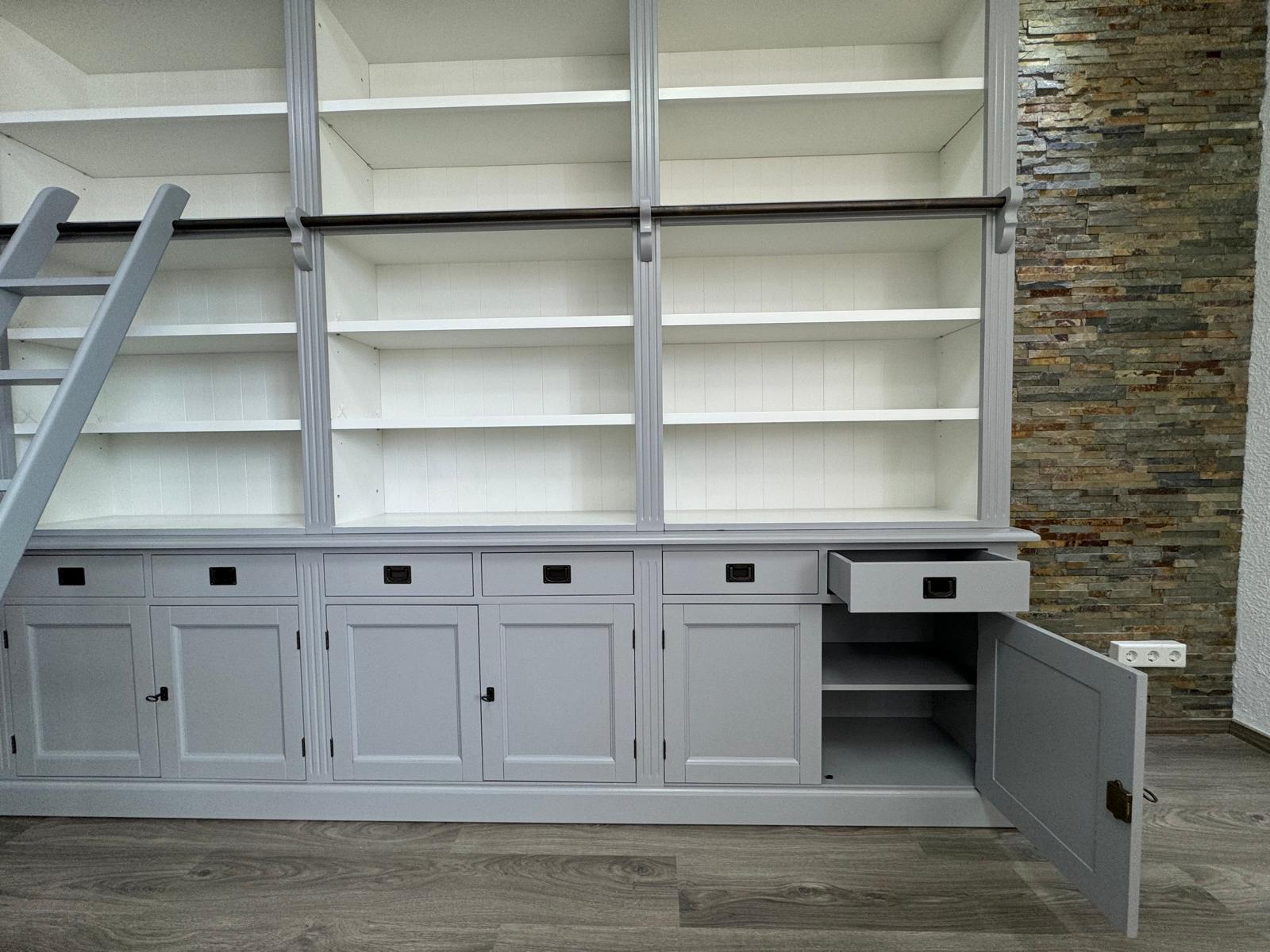 Bücherwand Bibliothek im Landhausstil – 300 cm Breite, mit Leiter und Softclose Schubladen