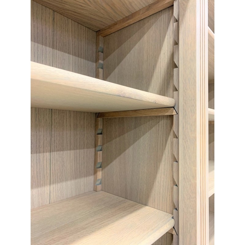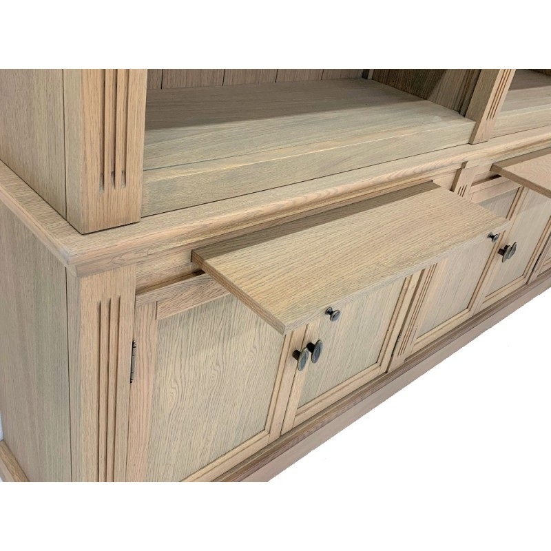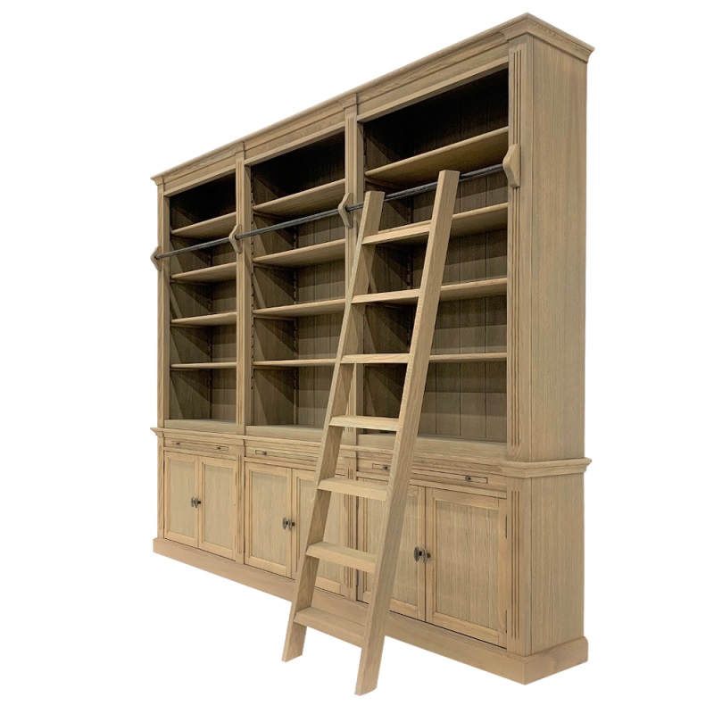 Dieses stilvolle Bücherregal beeindruckt mit einer Breite von 3 Metern und wird aus hochwertigem Eichenholz gefertigt. Die Einlegeböden im oberen Bereich sind flexibel verstellbar, sodass Sie sie individuell an Ihre Anforderungen anpassen können. Zusätzlich sind die Böden so konzipiert, dass sie auch schwere Lasten mühelos tragen. Auf Wunsch ist das Bücherregal auch ohne Leiter erhältlich.