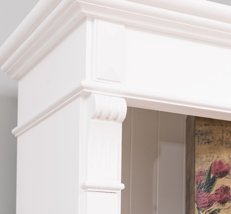Entdecken Sie die perfekte Fusion von Funktionalität und Ästhetik in unserem einzigartigen Möbelstück. Dieses beeindruckende Meisterwerk wird von erfahrenen Handwerkern in Europa aus 100 % massivem Kiefernholz gefertigt. Das Möbelstück wird in zwei separaten Teilen geliefert und besticht durch eine äußerst solide Konstruktion. Dies garantiert eine außergewöhnlich lange Lebensdauer und zuverlässige Nutzung. Der charakteristische Stil dieser zweifarbigen Glasvitrine verleiht Ihrem Raum eine einzigartige Eleganz. Die speziellen Verzierungen, die dieses Möbelstück schmücken, unterstreichen den Charakter und die anspruchsvolle Ästhetik. Die Pflege gestaltet sich mühelos. Ein leicht feuchtes Tuch genügt, um Staub und Schmutz zu entfernen. Mit großzügigen Abmessungen von 240 cm Höhe, 223 cm Breite und 51 cm Tiefe bietet dieses vielseitige Möbelstück nicht nur Eleganz, sondern auch reichlich Stauraum für Ihre Bücher und wertvollen Sammlerstücke. Ein Statement für Qualität und Stil, das Ihnen viele Jahre Freude bereiten wird. Abmessungen: H: 240 cm, B: 223 cm, T: 51 cm Massivholz Möbel Landhausstil 100% Kieferholz verschiedene Farben wählbar
