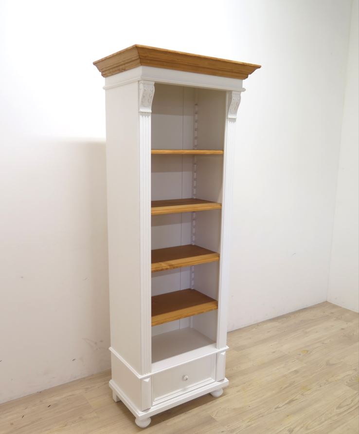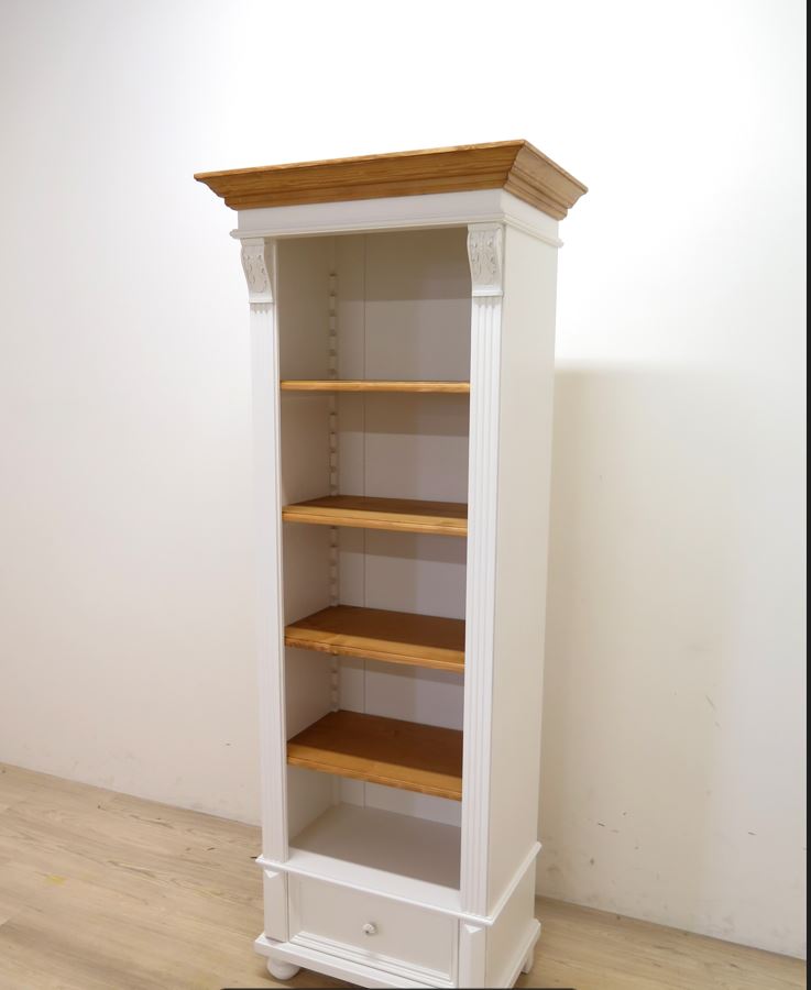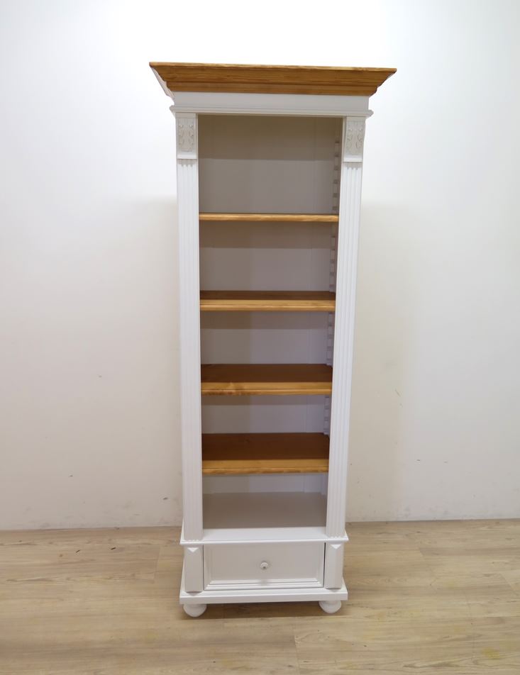 Der Korpus und die Schublade sind weiß lackiert, während Kranz und Regalböden liebevoll von Hand gewachst wurden. Diese Kombination aus frischem Weiß und natürlicher Holzoptik verleiht dem Regal eine helle, warme Ausstrahlung – zeitlos, elegant und authentisch.Das Möbelstück wird nach alten Vorlagen gefertigt und steht für echte Handarbeit und langlebige Qualität. Die sichtbare Holzstruktur der gewachsten Flächen sorgt für einen lebendigen, natürlichen Charakter. Mehrere stabile Regalböden bieten Platz für Bücher, Dekorationen oder Sammlerstücke. Die weiße Schublade im unteren Bereich sorgt für zusätzlichen Stauraum und fügt sich harmonisch ins Gesamtbild ein.