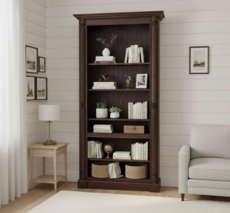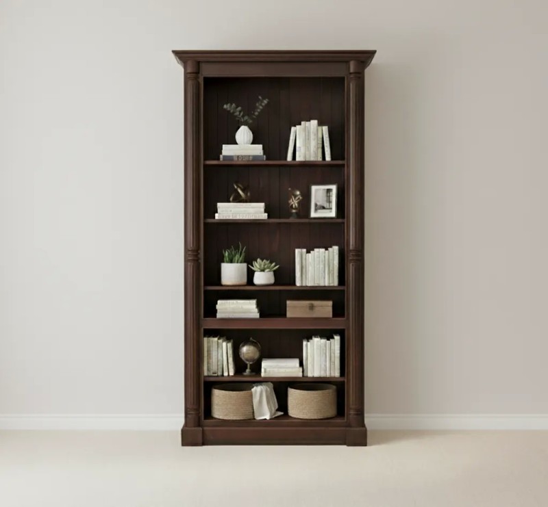 Sein elegantes Design mit klassischen Linien und formschönen Seitensäulen unterstreicht die natürliche Schönheit des Holzes und verleiht jedem Raum eine edle Note. Die fünf geräumigen Ablagen bieten viel Platz für Bücher, Dekorationen oder persönliche Gegenstände und machen dieses Möbelstück sowohl funktional als auch ästhetisch ansprechend. Die robuste Konstruktion garantiert Stabilität und Langlebigkeit. Das Produkt wird fertig montiert geliefert.