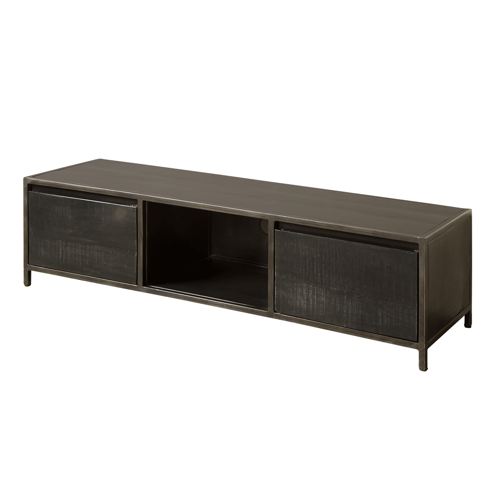 Der TV-Schrank Paterno 145 cm ist ein griffloses und industrielles Möbel aus Mangoholz und Stahl, das sich perfekt in ein Mix & Match-Interieur einfügt. Der TV-Schrank hat zwei Türen und ein offenes Fach.