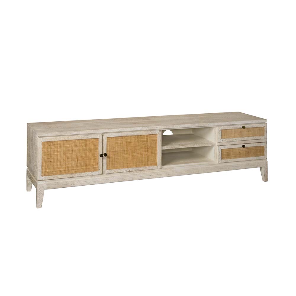 Vincenza ist ein komplettes Wohnprogramm mit natürlichem Charakter und Vintage-Stil. Der TV-Schrank Vincenza besteht aus Mangoholz und ist mit einer weißen Waschung versehen. Der TV-Schrank ist mit schönen Rattantüren und Schubladenfronten ausgestattet. Rattan ist im Interieur wieder voll im Trend. Dieses schöne, natürliche Material verleiht ein warmes Aussehen und ist außerdem sehr langlebig.