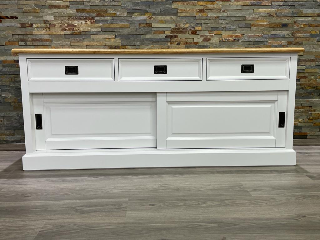 Ein TV-Lowboard im Landhaus Stil mit 3 Schubladen und praktischen Schiebetüren. Das TV-Board ist vielseitig nutzbar. Die Arbeitsplatte ist in Eiche natur abgesetzt. Das Sideboard im angesagten Landhaus-Stil ist ein zeitloses Möbelstück, welches überall in Ihrem Haus einen prägenden Eindruck hinterlässt. Nutzen Sie den großen Stauraum im Innenbereich, unterstreichen Sie durch die vielen Möglichkeiten mit den Wohnaccessoires den Landhaus-Stil.